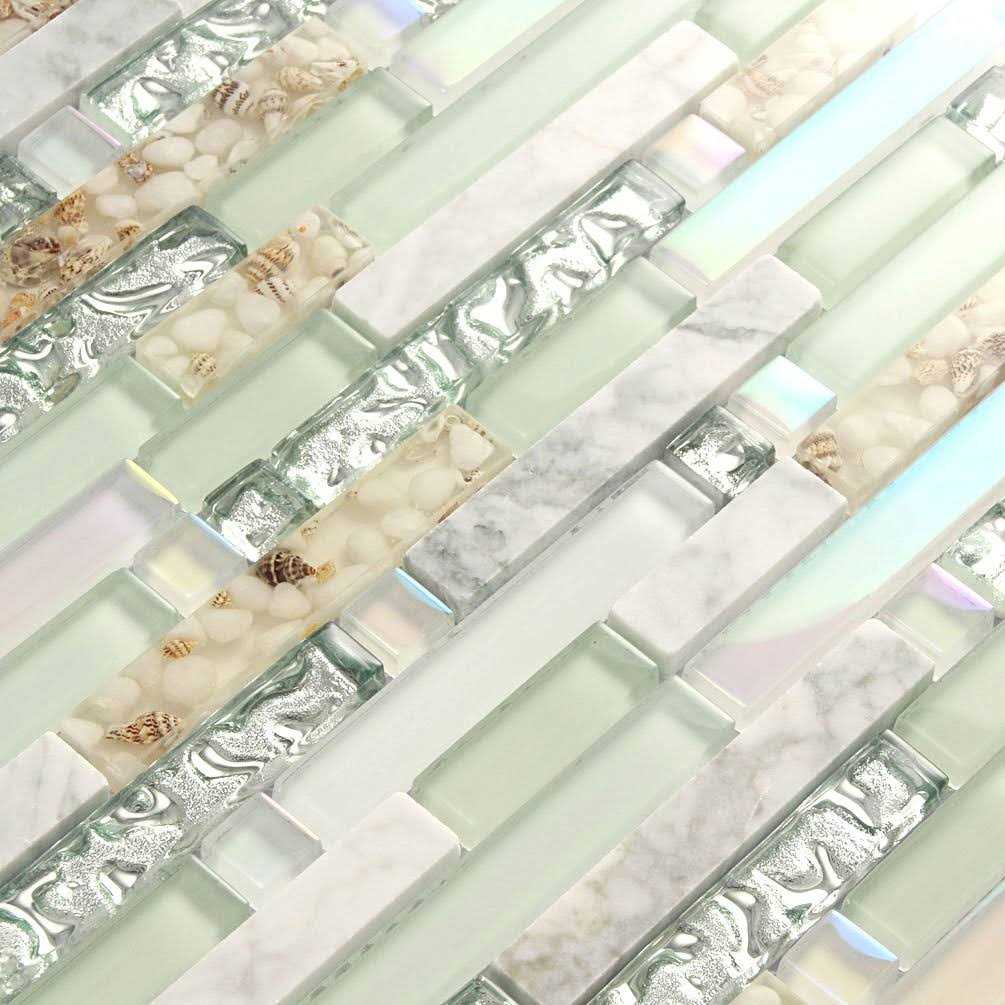 Beach Style Wall Tile Mosaic Kitchen Backsplash Tiles Green Bathroom Silver Glass Conch Stone White Marble Iridescent Mosaic Art Deco Sheets
