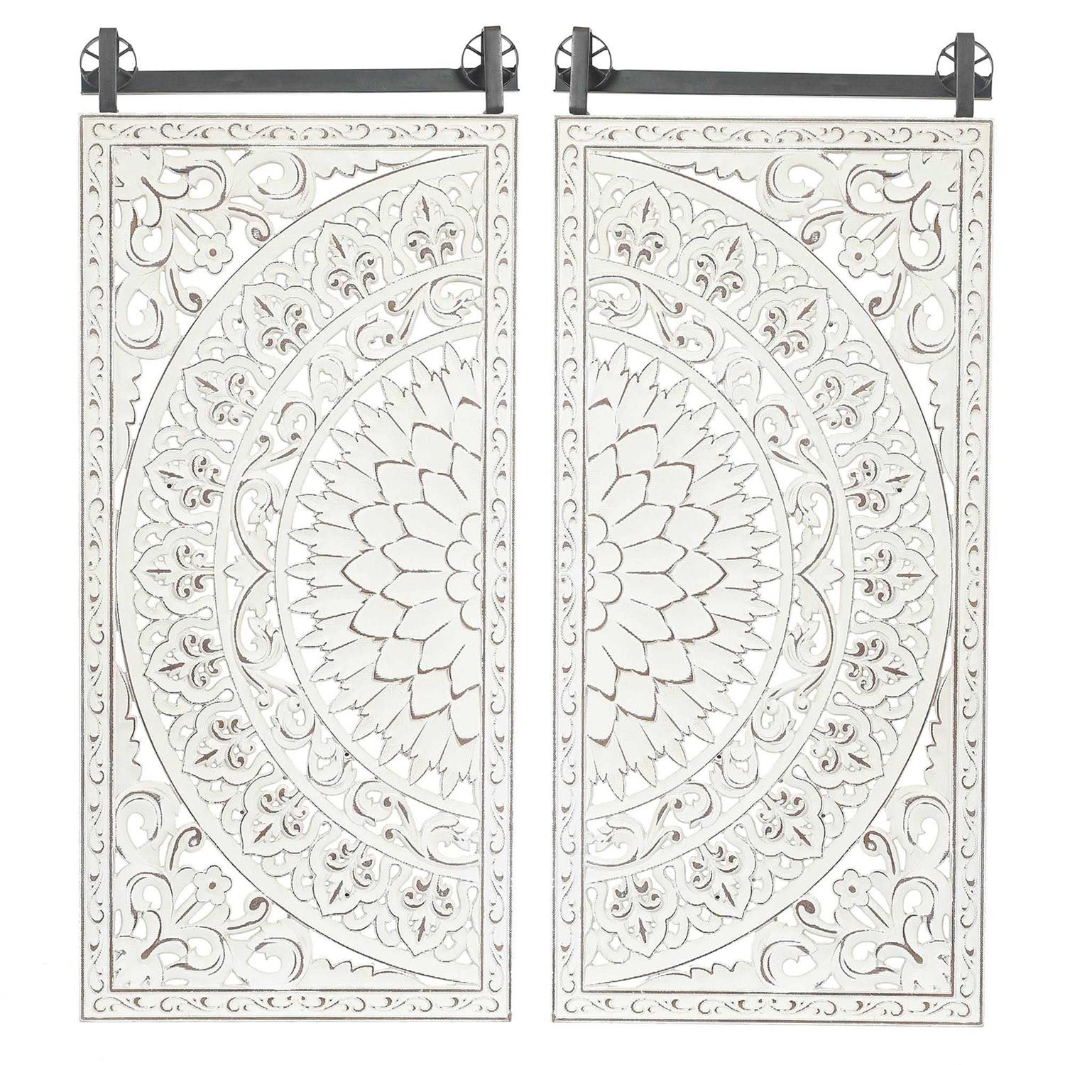 LuxenHome Set of 2 Distressed Ivory White Wood Flower Wall Decor