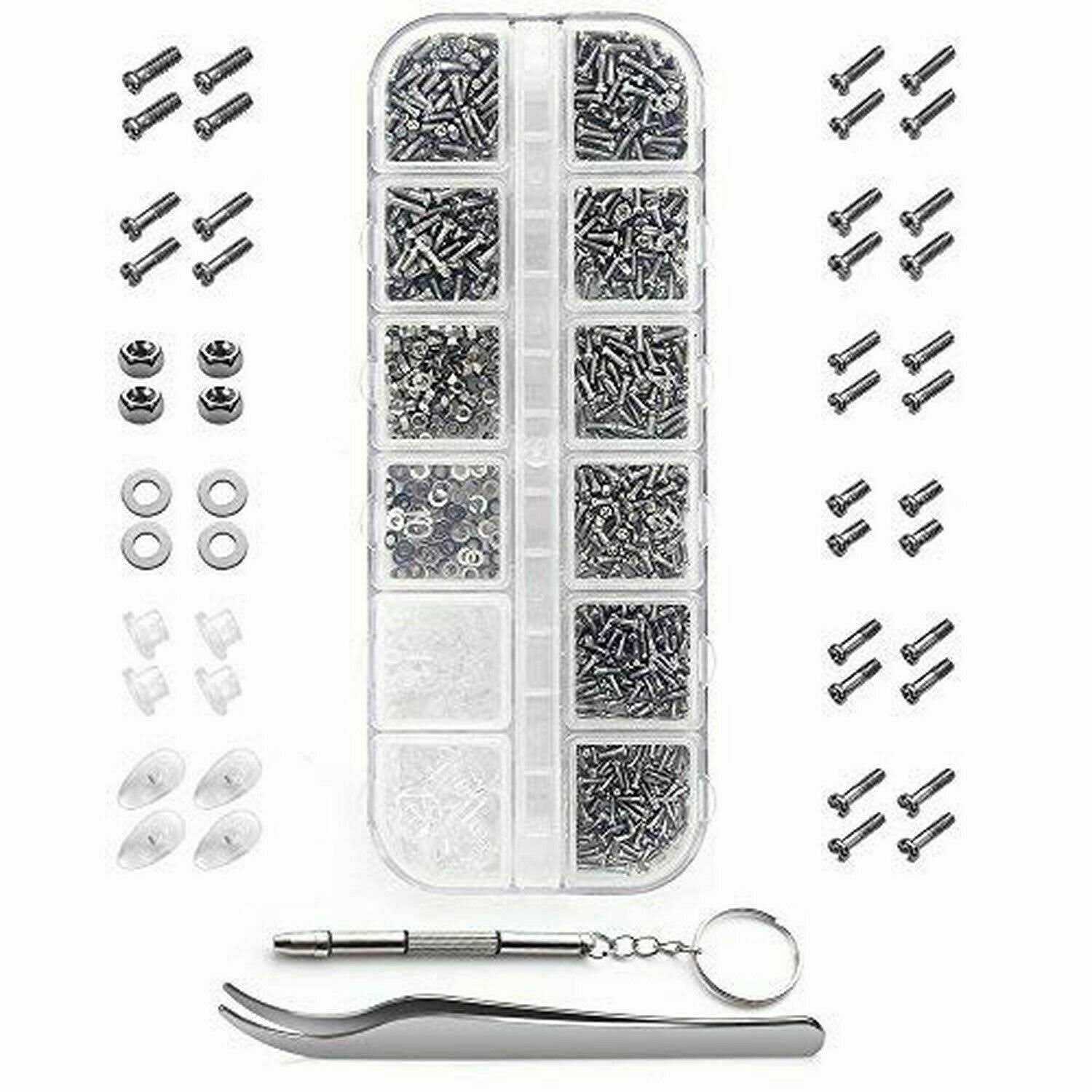 Eyeglasses Repair Kit, 1100Pcs Tiny Screws and 5 Pairs Nose Pads Stainless Steel Set with Micro Screwdriver Tweezer for Glasses