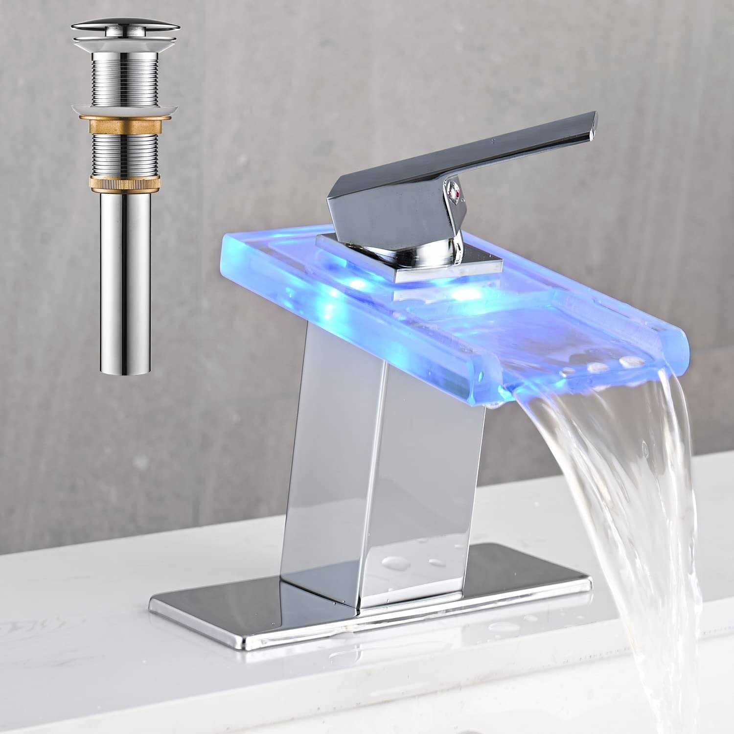AVSIILE LED Bathroom Sink Faucet, Chrome Waterfall Single Hole Handle RV Bath Vanity Faucets for Sinks 1 Hole with Metal Pop Up Drain and 2 Water