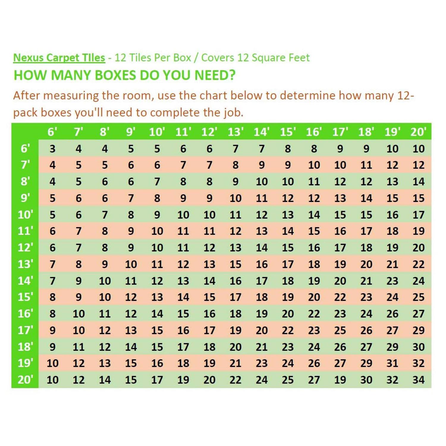 Achim Nexus Self Adhesive Carpet Tiles are a quick way to upgrade your space with a modern take to old-school carpeting. You can mix and match colors to form patterns or stick with solids to create a unique look. The Achim Nexus Carpet Tiles are ribbed in texture to give it a homey feel and made of 100 percent durable heavy duty polyester. Achim Nexus Carpet tiles are ideal for your home, office, basement or garage. Installation is easy to do. You just peel and stick the carpet tiles to a flat and dry surface. Vacuum regularly and spot clean as needed. Get ready to show off your beautiful new room to all your family and friends! This is the perfect Do It Yourself project to transform any room in your home! Our chart provided above tells you how many boxes of carpet tiles you need to complete your project.