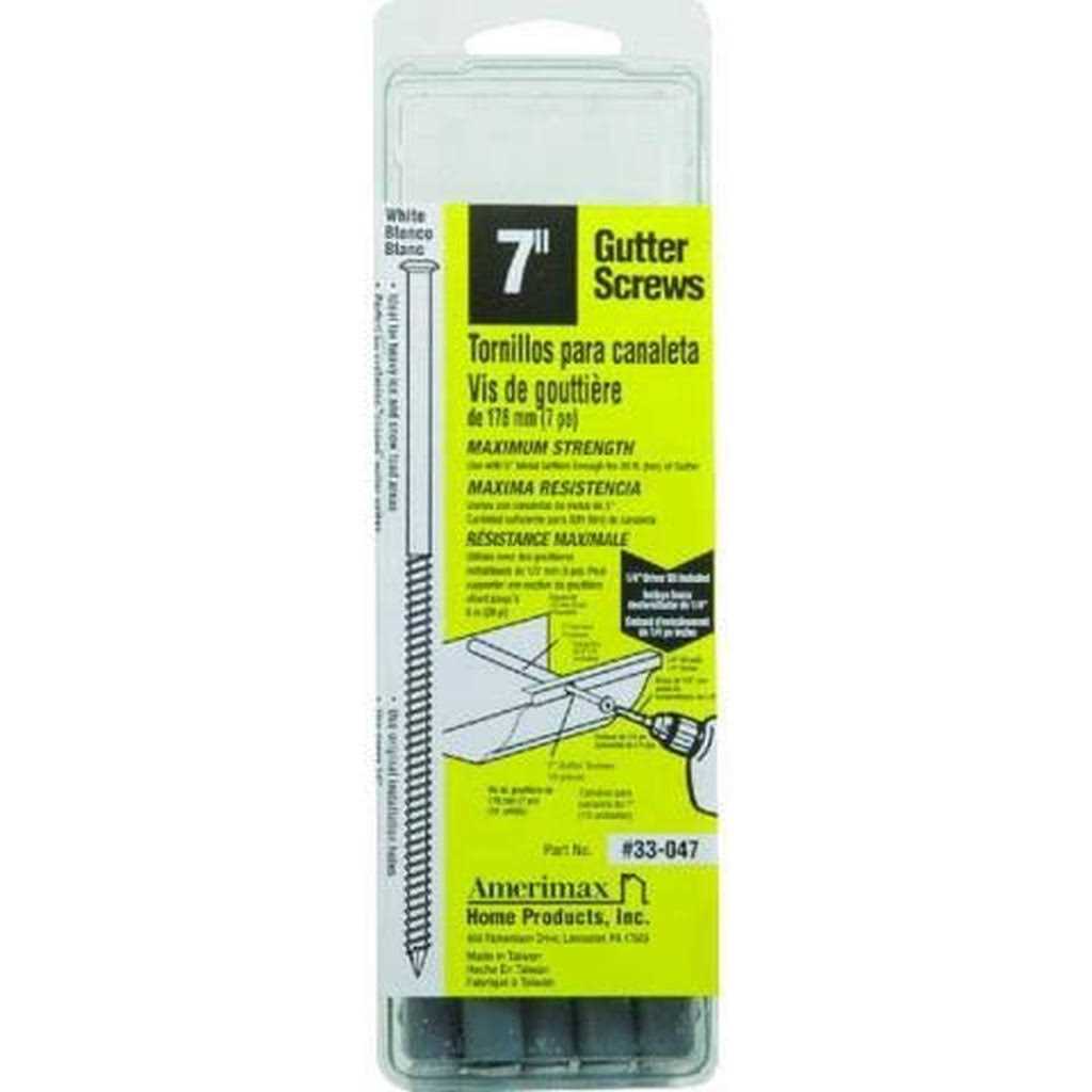 The Amerimax hex head galvanized metal Gutter Screws with Ferrules are perfect for securing your gutters securely! The ten-in-one pack includes seven-inch screws, ferrules, and a drill bit o hang five-inch white metal gutters. These fasteners are everything you need to install new gutters with less hassle involved. The seven-inch metal gutter screws provide maximum holding strength and drill bit mount screws and ferrules. These gutter fasteners are ideal for heavy ice and snow load areas. The Amerimax gutter screws and ferrules can be used for replacing popped gutter spikes.