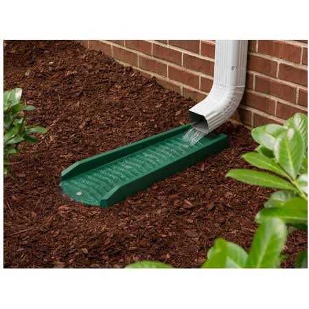 Splash blocks rain way – green – 11-1/2 inches wide by 24 inches long. Made of space age material for longer life. Stabilizer to help prevent fading. Needs no anchoring, unique splash deflector provides a wide dispersion of water.