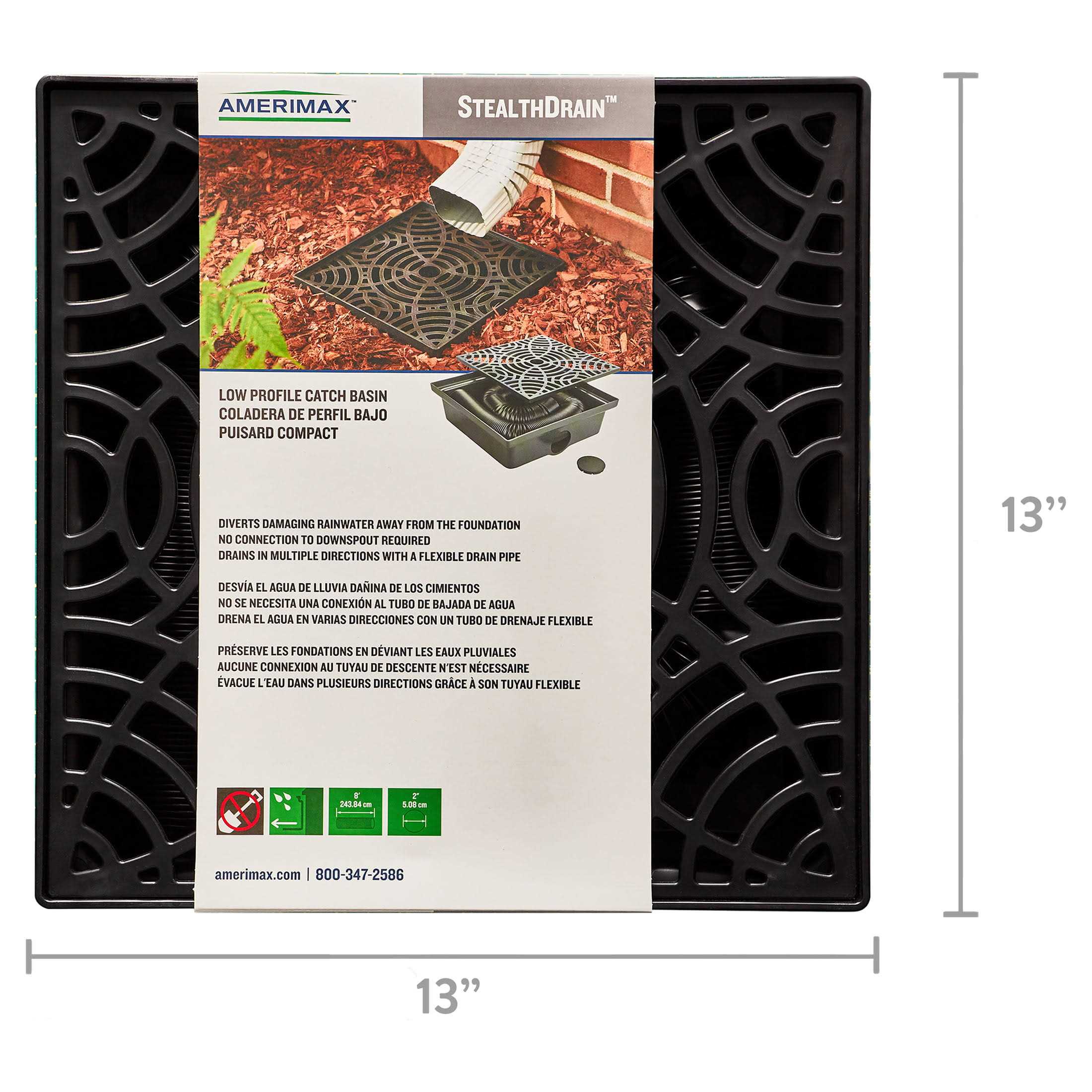 The Amerimax StealthDrain low-profile catch basin allows you to move damaging rainwater away from your home with the look of a buried drainage system without the cost. The low-profile design creates an unobtrusive look and can be covered with mulch straw or stones for a subtle appearance with no digging required. Simply cut the included 8 ft. length of 2 in. pipe to your desired length screw it into the supplied drain holes extend the pipe to direct the rainwater in your desired direction and bury it under mulch stone or pine straw. Be sure to utilize both drain holes when utilizing under a 3 in. x 4 in. downspout due to increased water volume.