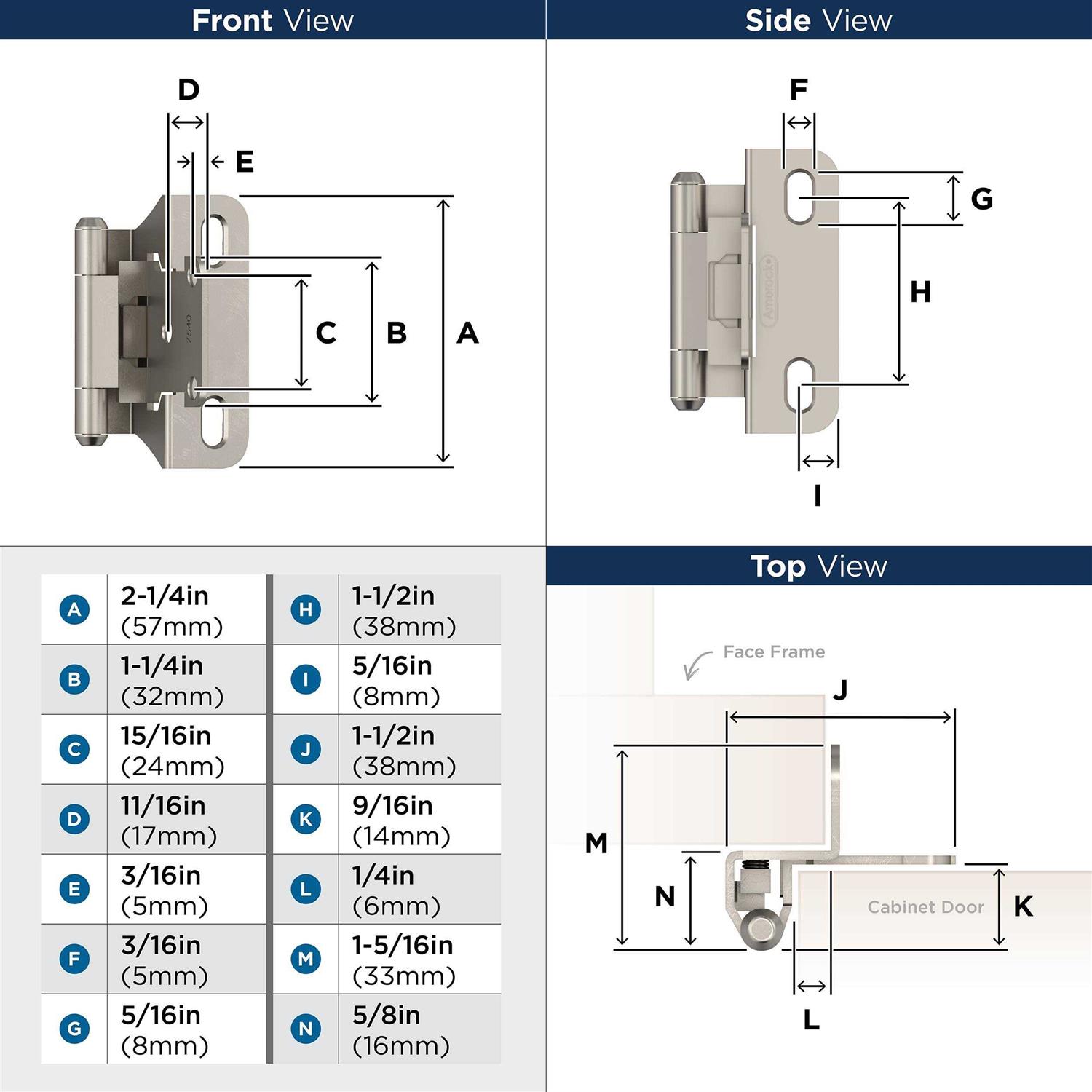 Designed for 1/4” overlay doors, these hinges offer a clean look with easy no-mortise installation. The Partial Wrap design features slotted holes on the cabinet member, allowing easy height adjustment. Since the spring holds the door shut and the rabbet acts as a stop, no catch is required, ensuring both convenience and cost savings. Amerock cabinet hinges are well-suited for a wide variety of furniture and cabinetry projects. With a selection of attractive finishes, they are right at home in both traditional and modern decors. Includes matching screws.