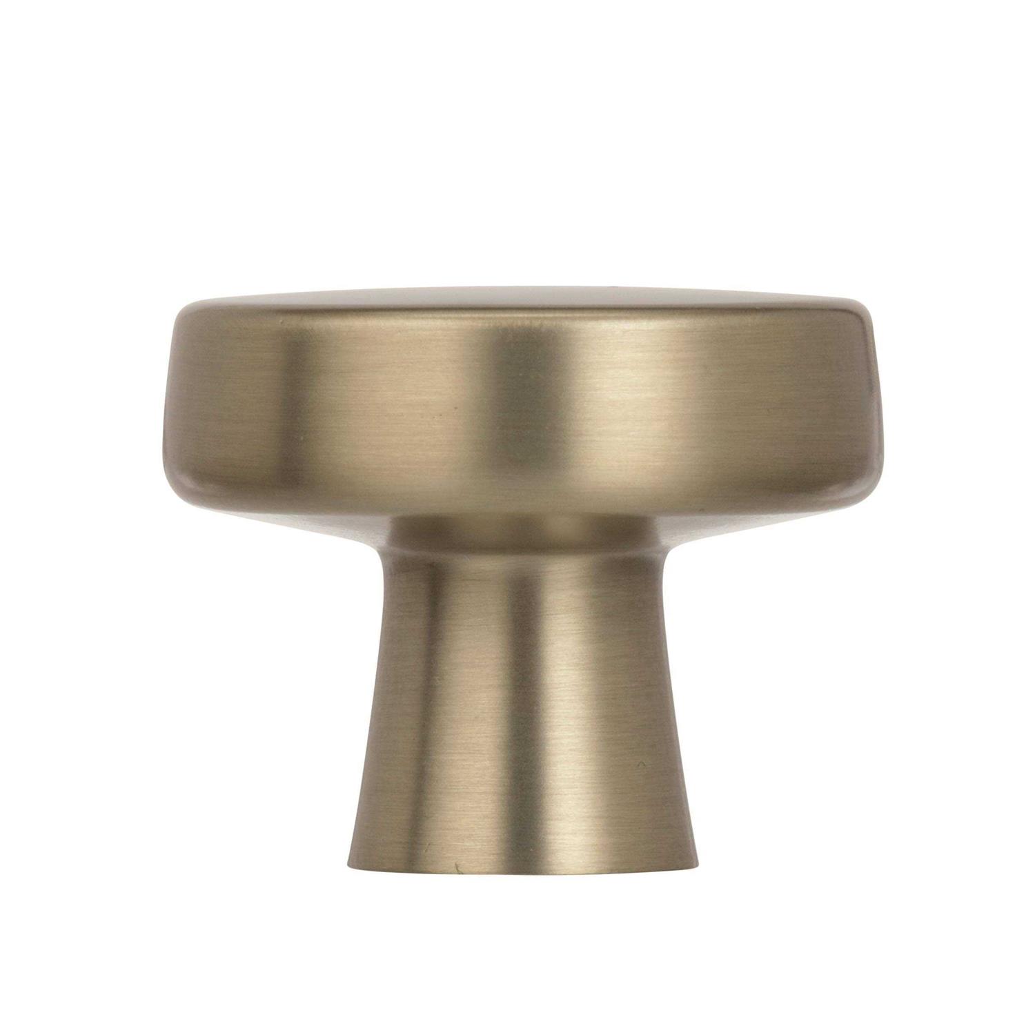These simple, refined knobs feature a smooth surface and a tapered geometric shape. Cast in zamak, available in golden champagne, black bronze, satin chrome, champagne bronze and polished chrome finishes. Sizes given are diameter by height. Mounting bolts included.
