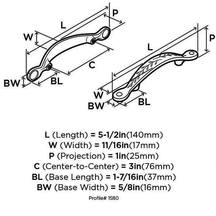 This leaf motif handle is versatile and simple in form. Available in dark wrought-iron, antique brass, oil-rubbed bronze and weathered nickel finishes, it mounts on 3″ centers. All mounting hardware is included, and the finish has a lifetime guarantee in consumer use. A Substantial and high-quality casting.