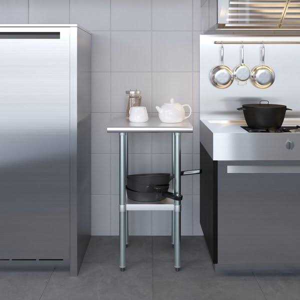 A Stainless Steel Utility Work Table is a great addition to any home or business. It is perfect for a variety of tasks, including a workbench, prep table, or general-purpose table. The included bottom shelf provides additional storage space. Some assembly is required. NSF certification allows the table to be used in any food service environment. The table is made with corrosion resistant 430 stainless steel top and galvanized legs and bottom shelf. It’s built to withstand heavy use and everyday wear and tear. Whether you need a sturdy workspace for your next DIY project or simply want an extra prep area in the kitchen, this utility table has you covered. It incorporates a heavy duty adjustable galvanized bottom shelf and leveling feet. Two of which are locking Height: 35″ NSF Certified Sturdy & easy to setup Heavy Duty This heavy-duty industrial quality multi-purpose stainless steel utility table is a great fit for a variety of commercial and residential applications such as commercial kitchens, garages, labs, laundry room, etc The tabletop is made with 18 gauge 430 stainless steel The bottom shelf and the legs are made with galvanized steel. Adjustable bullet feet allow to improve stability on uneven floors and prevent the floor from being scratched. NSF certified to meet the strictest standards for public health protection. The industrial-quality manufacturing process meets the highest regulatory requirements for construction, safety, and durability Made with corrosion resistant 430 Stainless Steel table top. Assemble and install with no effort. No additional tool or kit needed. Assembly instructions and everything you need is included.