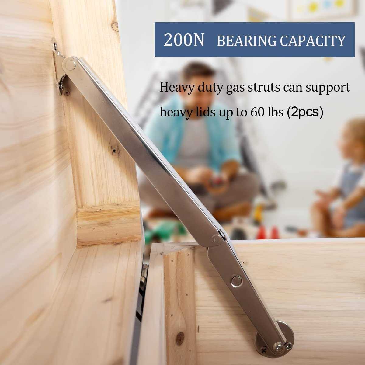 This lid support hinge heavy duty is perfect for safety solution to big lid, highly functional and practical. Its a great idea of heavy lid hinges as like chest or toy box hinges soft close and slow lowering. Package: 2x 200N soft close hinges Material: Steel construction Lid support opening angles: 75-105 Weight Capacity: 200N (Support 60lbs/2pcs, 30lbs/1pc). Heavy duty hinges for wooden box, not suitable for lid lightweight! FEATURES OF CHEST HINGES : Heavy duty hinges 200N gas struts make sure you can build a chest which has a heavy lid that is easy to open and close. It is strong and sturdy. Soft close hinges Safety is the priority. The excellent soft close design protects the finger from smashed. Good gift fit for the the heavy lid or storage chest project, also can be used as soft close hinges for toy box (bigger or heavier). Efficient Very easy to install. The compact design allows for installation in tight fit areas. This chest hinges can be installed on left or on right, yet what you have to do is remove the screw from the disc, flip it, then reattach. Also can be used for side-mounting and top-mounting. Convenient The safety hinges will meet your expectations if you are getting tired of having to hold the heavy lid up and only having one hand free to reach in. After installing the hinge, the lid will lift up or down for your convenience. Those slow close hinges are widely usage and suitable for lifting the heavy lid or storage chest project, used as lid support hinges for chest, big toy box hinges, blanket chest hinges, bench hinges, seat hinges, duck or dog house roof too. So the gas struts heavy duty hinges make sure you can build a chest which has a heavy lid that is easy to open and close. It is even easy to open by kids with no resistance, and will hold the lid opened until you want to close. Finally, insure toy box hinges soft close, no more smashed fingers! PROP 65 WARNING: This product can expose you to some kind of chemical, which is known to the State of California to cause cancer.