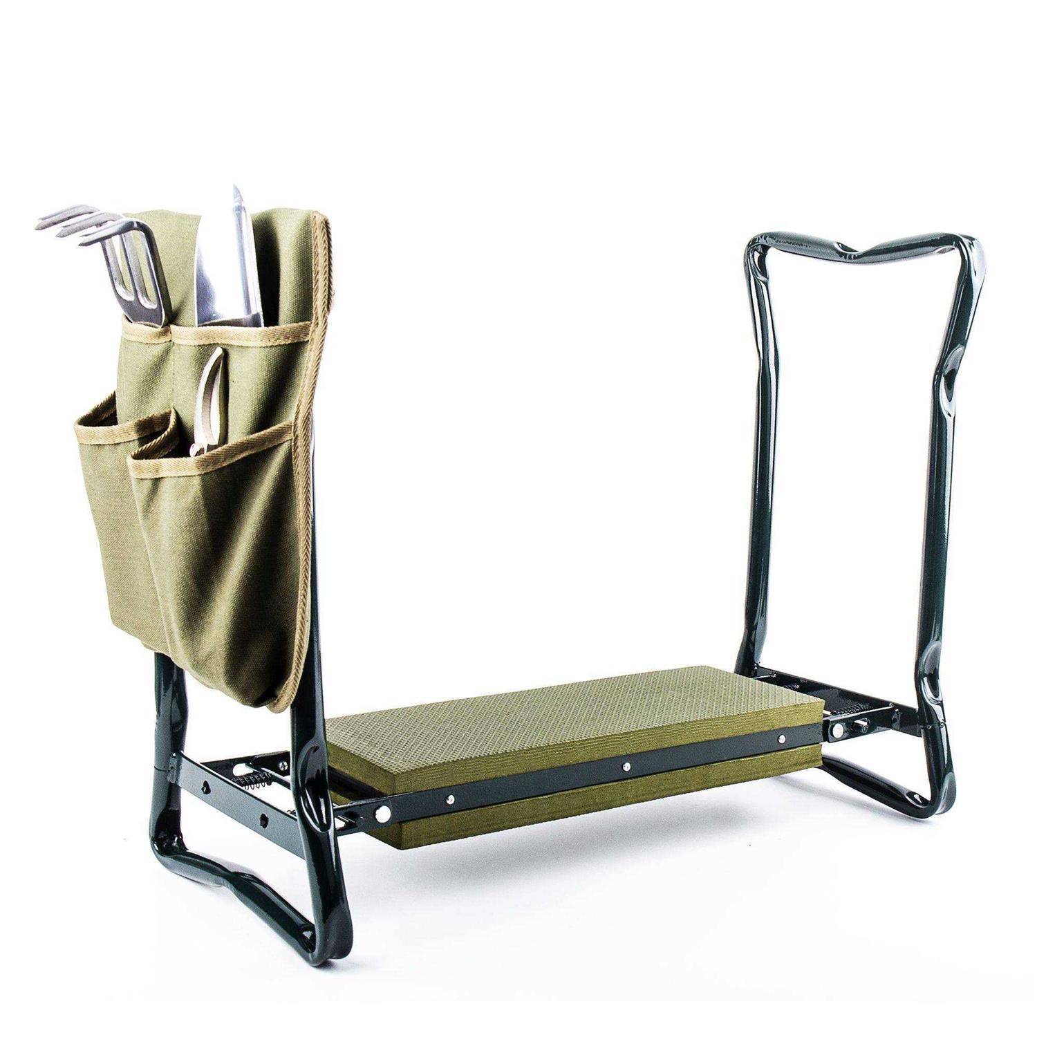• 2-in-1 kneeler/seat is foldable, padded, and can be used to kneel or to sit