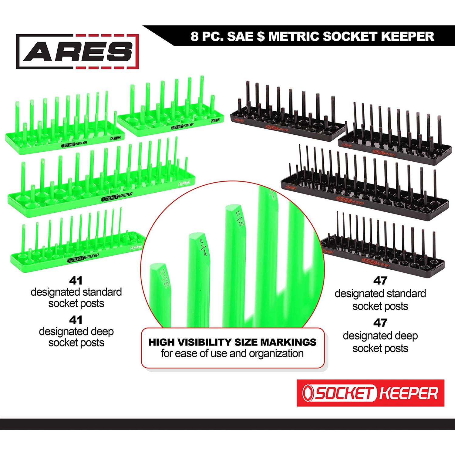 Ares 60178 – 8-Piece Metric & SAE Socket Keeper Socket Organizer Tray Set – Black & Green Socket Holders – Store 176 Standard