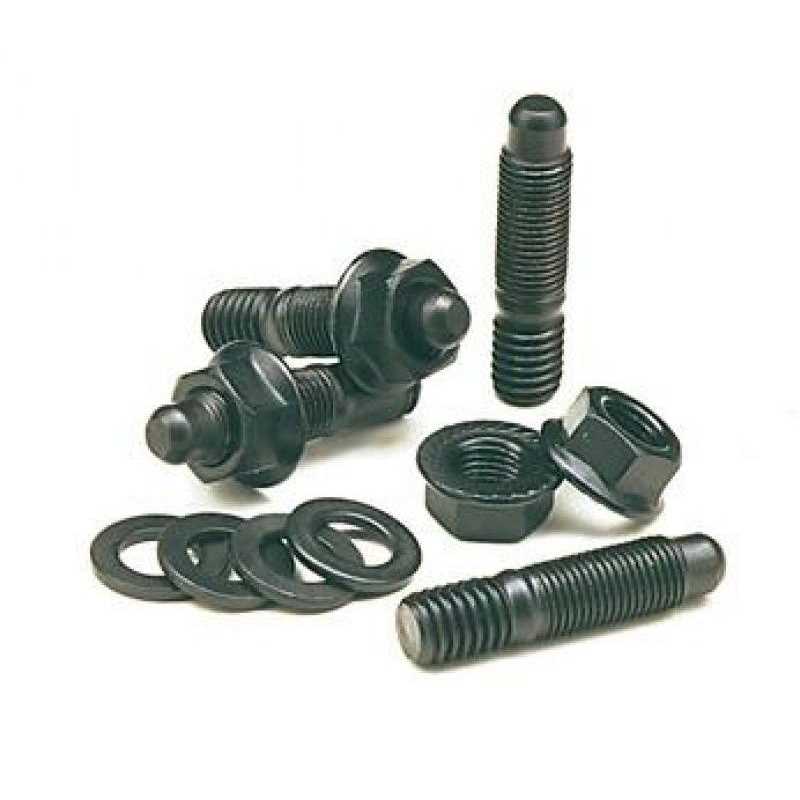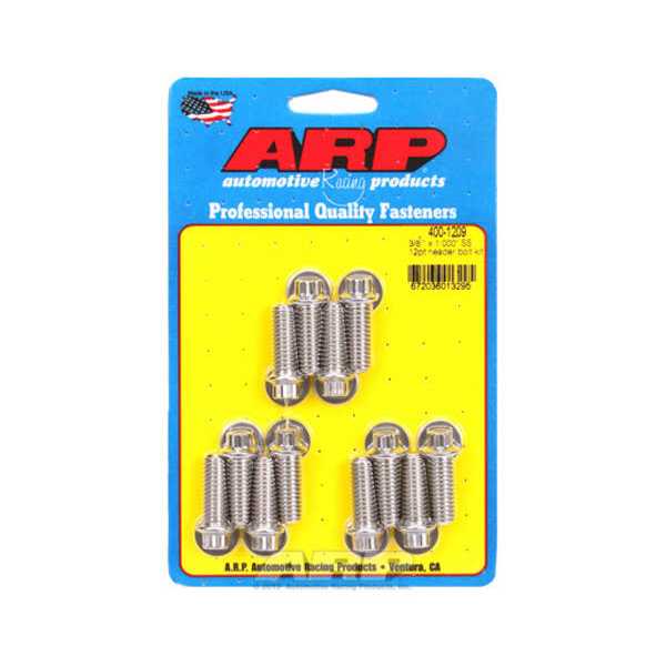 ARP manufactures a variety of premium grade bolt and stud kits to facilitate installation of exhaust headers including the popular stainless stud kit with 12-point nuts. The Stainless 300 material is not affected by corrosion or extreme heat making it ideal for the application. Whats more the compact 12-point nut lets you easily slip a socket close to the pipe. Each ARP accessory stud or bolt kit includes the specific number of parts for your application plus premium-quality washers and hex or 12-point nuts as required. Studs are manufactured with a unique nut-starter nose that helps prevent cross-threading. Studs and bolts come either black oxide chrome moly or Stainless 300. Both are nominally rated at 170000 psi tensile strength; substantially stronger than Grade 8 hardware. Specially drilled NASCAR models are available for those who wish to safety wire their header bolts to prevent loosening.Special NASCAR model header bolts are available that are drilled for use of safety wire. Perfect for any racer who desires the ultimate in security. Available for small block and big block Chevrolet engines plus many universal applications.