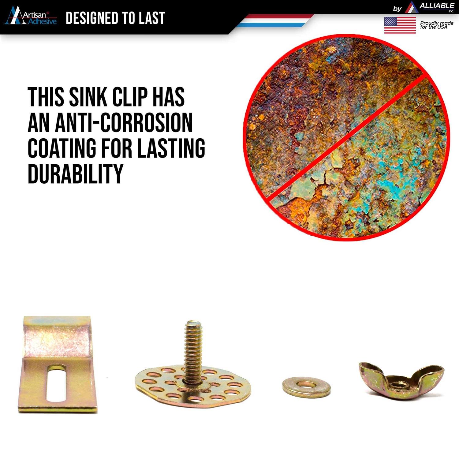 Sink Installation Parts by Artisan Adhesive. Details:Our Artisan Adhesive Sink Clips are perfectly made for any undermount kitchen sinks & undermount bathroom sinks. Made with a sleek and cutting-edge finish, each package comes with 10 sink clips for a great value on a budget. Installation is made so easy that no special tools are required to put them on and will keep the sink nicely locked in place.