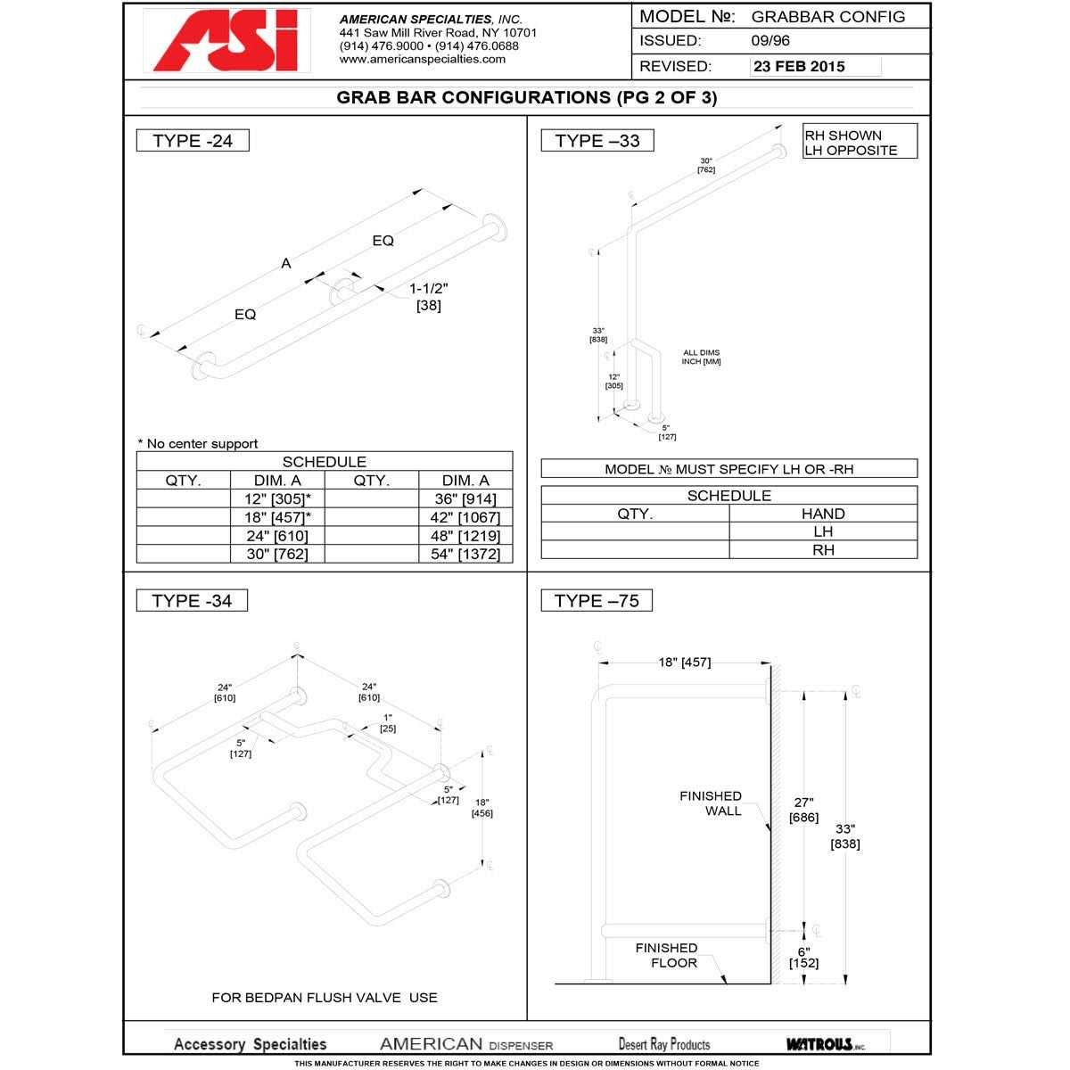ASI’s Matte Black Collection provides a chic alternative for modern washrooms. Carefully curated to be versatile and powder coated for added durability, these accessories are ready to make a statement in any setting. The boldness of black creates an air of sophistication, while the subtlety of the matte finish exudes warmth. Features include cover that snaps over mounting flange dimples to conceal screws and concealed mounting flange of 3-1/8″ (79 mm) O.D. diameter with 2 screw holes and 3 locking dimples; 1/8″ (3 mm) thick, type 304 stainless steel. Cover is type 304 stainless steel with a matte black powder coated finish and 22 gauge, 33/16″ (81 mm) diameter. 1-1/2″ DIA (38 mm) 3800-41 Series Straight Grab Bar With Matte Black Powder Coated Finish Specification:1-1/2″ Diameter [38] Grab Bar with Snap-On Flange Covers for concealed mounting shall be type 304 stainless teel alloy 18-8. Tubing shall be 1-1/2″ diameter [38] x 18 gauge (0.048″) [1.2]. Snap-on cover shall be 22 gauge (0.03″) [0.8]. Flange shall be 1/8″ [3] thick and shall be heliarc welded to tubing with a continuous concealed bead. End flanges shall have two (2) 5/16″ diameter [7.5] mounting holes. Center posts (if any) shall have (2) keyhole slots to ease installation access. All exposed surfaces shall have a satin finish and shall be protected during shipment with a plastic bag. For optional non-slip surface add suffix P (peened).