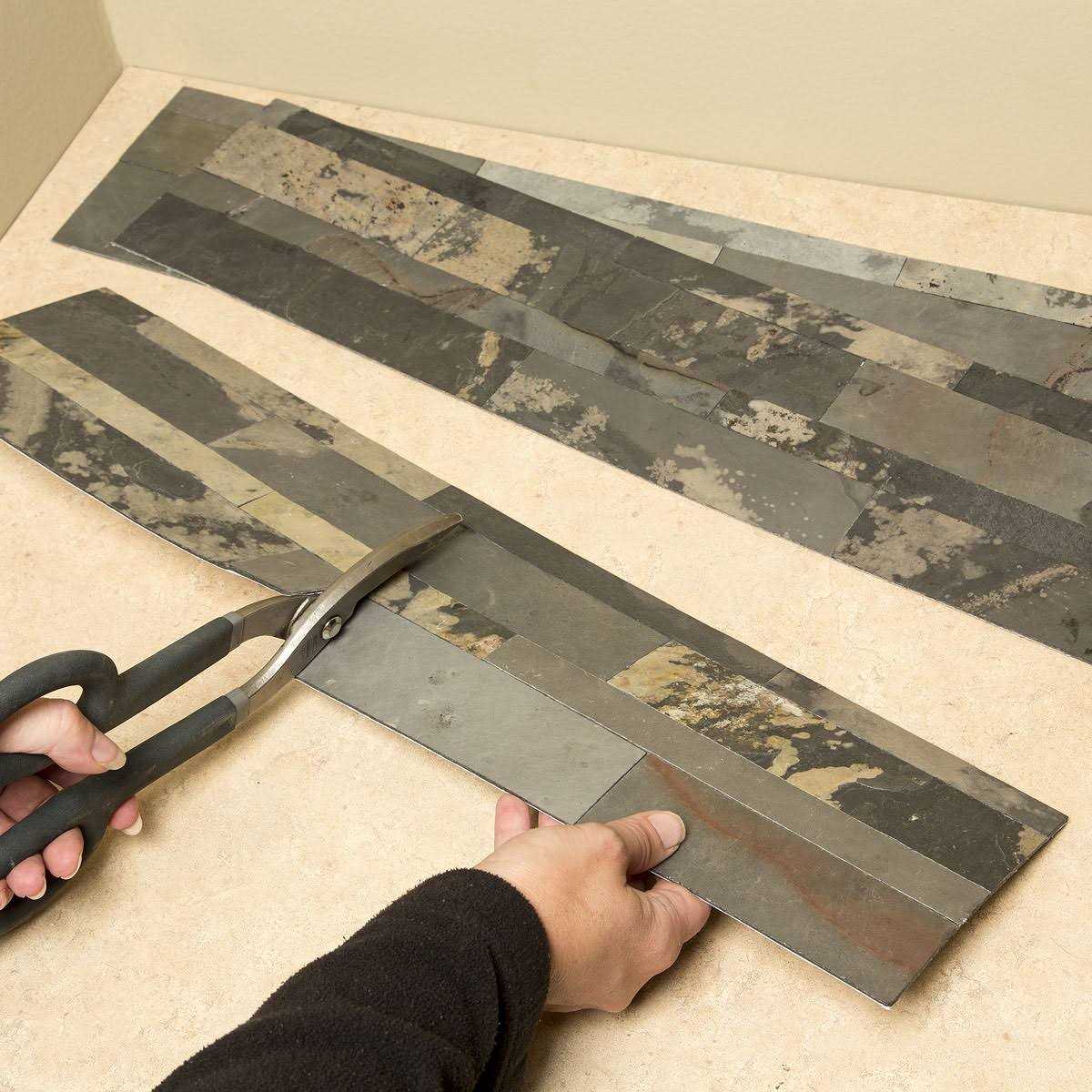 This real stone is a flexible, lightweight, approximately 1/8 inch thick tile backsplash product that offers the DIY homeowner a thin-cut stone option for a fraction of the price of its designer counterpart. Simple peel and stick installation eliminates the need for mortar or grout, and no contractor is necessary. Aspect Stone backsplash tiles are available in a variety of earth-tone natural colors providing endless options for your kitchen backsplash ideas. These backsplash panels can be treated with a stone sealer or impregnator to provide protection in high use areas. Aspect Trims are also available to complete your kitchen backsplash peel and stick project. Aspect Stone is made by starting with a 24 to 36-inch thick slab of natural quarried sedimentary stone. The exposed face is chiseled and cleaned so the remaining surface is smooth, level and the natural pores of the stone have been opened. A proprietary resin liquid is applied to the exposed face and soaks into the stone. After the resin has cured and dried, the application is repeated a number of times in combination with an application of a fiberglass mesh. After the final cure period, the resin and fiberglass mesh form a secure bond with the stone. A skilled stone craftsman then fractures and peels a 1/16-inch thick layer away from the large slab, yielding a thin section of bonded real stone. Using highly accurate automated saws, the layers are cut into various ledge stone sizes and the individual thin pieces are hand applied to a peel and stick foam adhesive. The ledge stone pattern is cut one last time to ensure it is accurate, level and square, to yield the all-natural 6-inch x 24-inch ledge stone panel. The thin layer of the sedimentary stone, cured resin backer and peel and stick foam adhesive combined make a beautiful, real stone product which is flexible yet can be cut with simple shears.