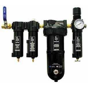 Provides -30 degree dew point. Includes 40 micron water removing filter, .01 micron coalescing filter, 2 quart desiccant dryer, 3 micron filter/regulator and shut-off valve. Includes 2 quarts of desiccant beads.