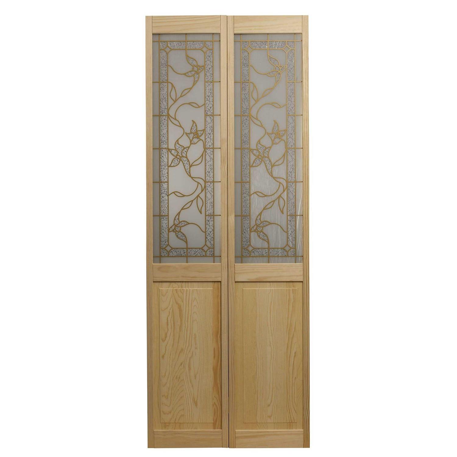 The charming ivy vine design glass panel is trimmed with simulated brass accents over a quality raised wood panel. This door is constructed of 1-1/8-Inch clear stiles and rails, with no finger joints and a raised panel bottom. The door is unfinished which means it’s ready for paint or stain. All hardware and detailed instructions are included. The tempered safety glass design allows light filtration while enhancing the beauty of your home. The glass piece is filmed in plastic for ease in finishing.