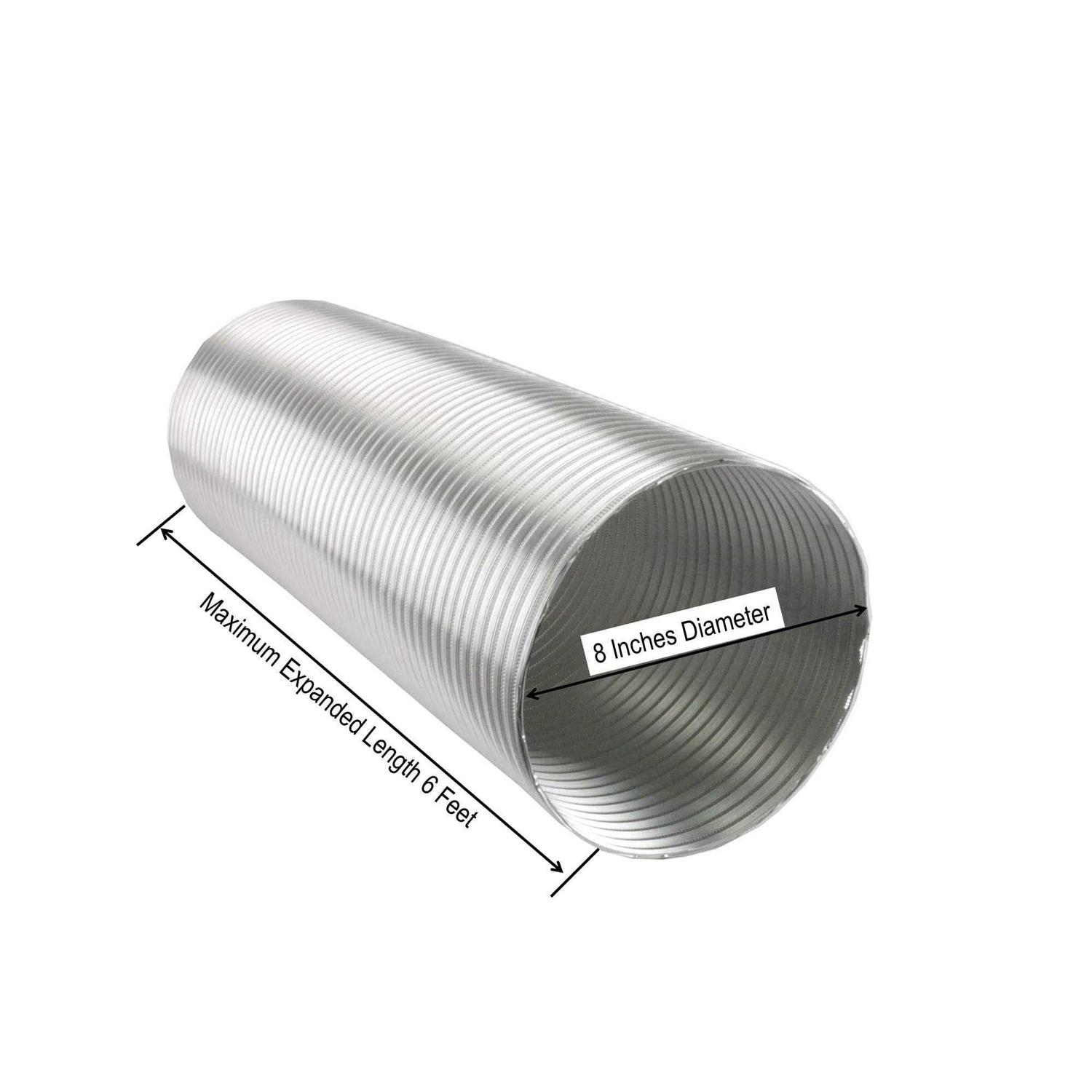Vents by Awoco. Details:Semi rigid fully flexible plain-ended duct that holds its shape to improve airflow. Made with noncombustible corrugated aluminum continuous lock seams to keep the duct in place which allows for easy installation. Non insulated general purpose venting duct for low & medium operating pressures is ideal for kitchen, bathroom, and range hood venting. Fit Awoco 8” top vent range hoods perfectly. It requires 2 people with 2 hands grabbing more edge area to fully expand the duct. Make sure to expand the duct slowly to prevent the duct from pulling apart due to using too much force. Diameter 8 in, Maximum Expanded Length 6 ft. Package includes: 1 Semi.