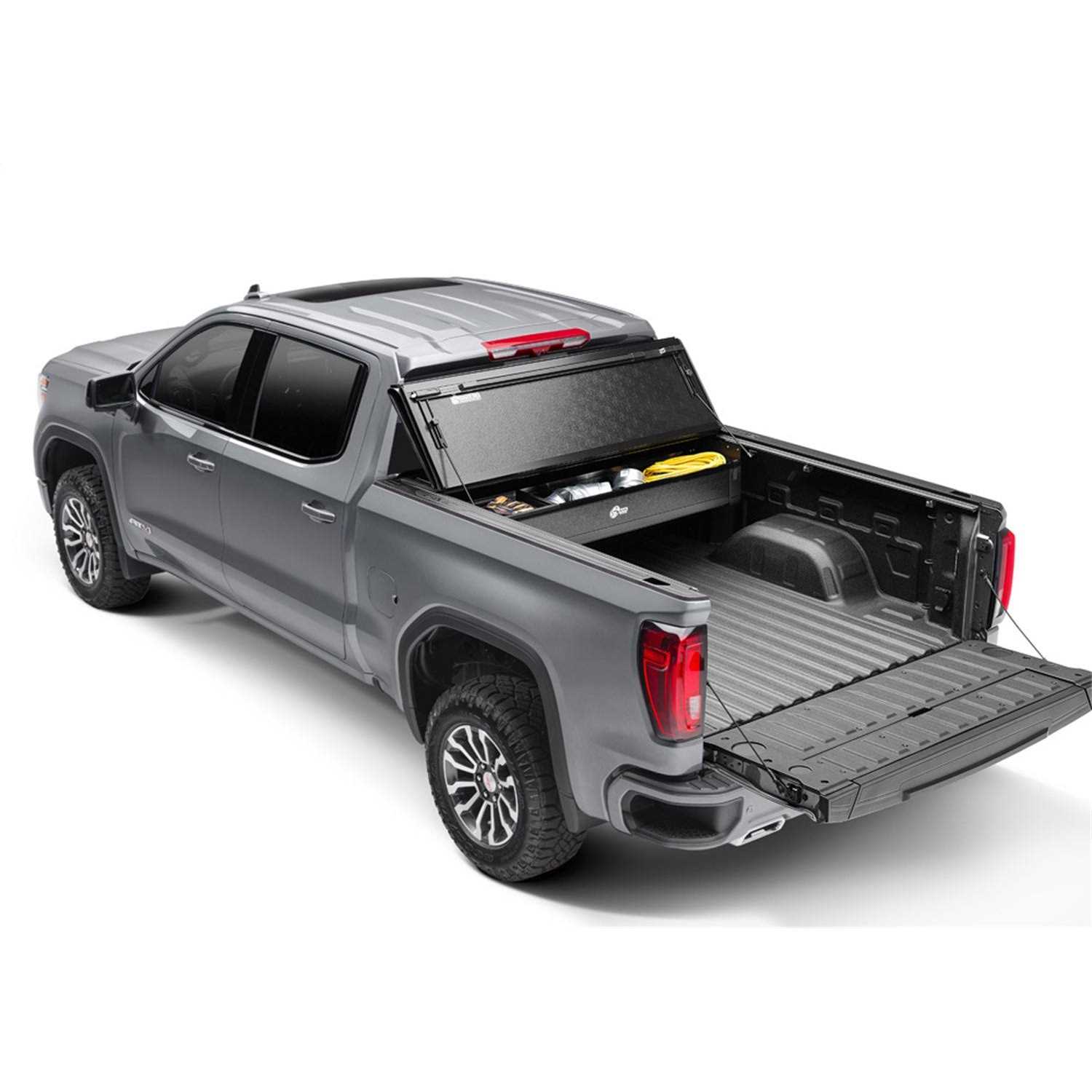 The BakBox is a collapsible cargo or toolbox that snaps onto the rail of any BakFlip tonneau cover. When it’s installed and the cover is closed, nobody will even know that it’s there. The BakBox flips out from the back wall of your truck to give you a full, secure tool chest and cargo management box. It disappears just as easily when you don’t need it or simply need to use your full truck bed! The BakBox is 11 inches deep and 10 inches wide and up to 65 inches long, giving you a very generous size box behind your cab and can withstand up to 400lbs of weight, allowing you to store heavy tools or objects. The BakBox will keep all contents safe and dry when your BakFlip tonneau cover is closed. Carry tools, groceries, clothes, books, you name it, the BakBox will be there when you need it! The shifting tray allows management of small objects that can easily be slid out of the way or shifted from side to side of your way. Add ice and it becomes one incredible party chest! BakBox is built to last and easy to install!