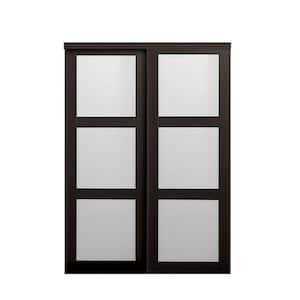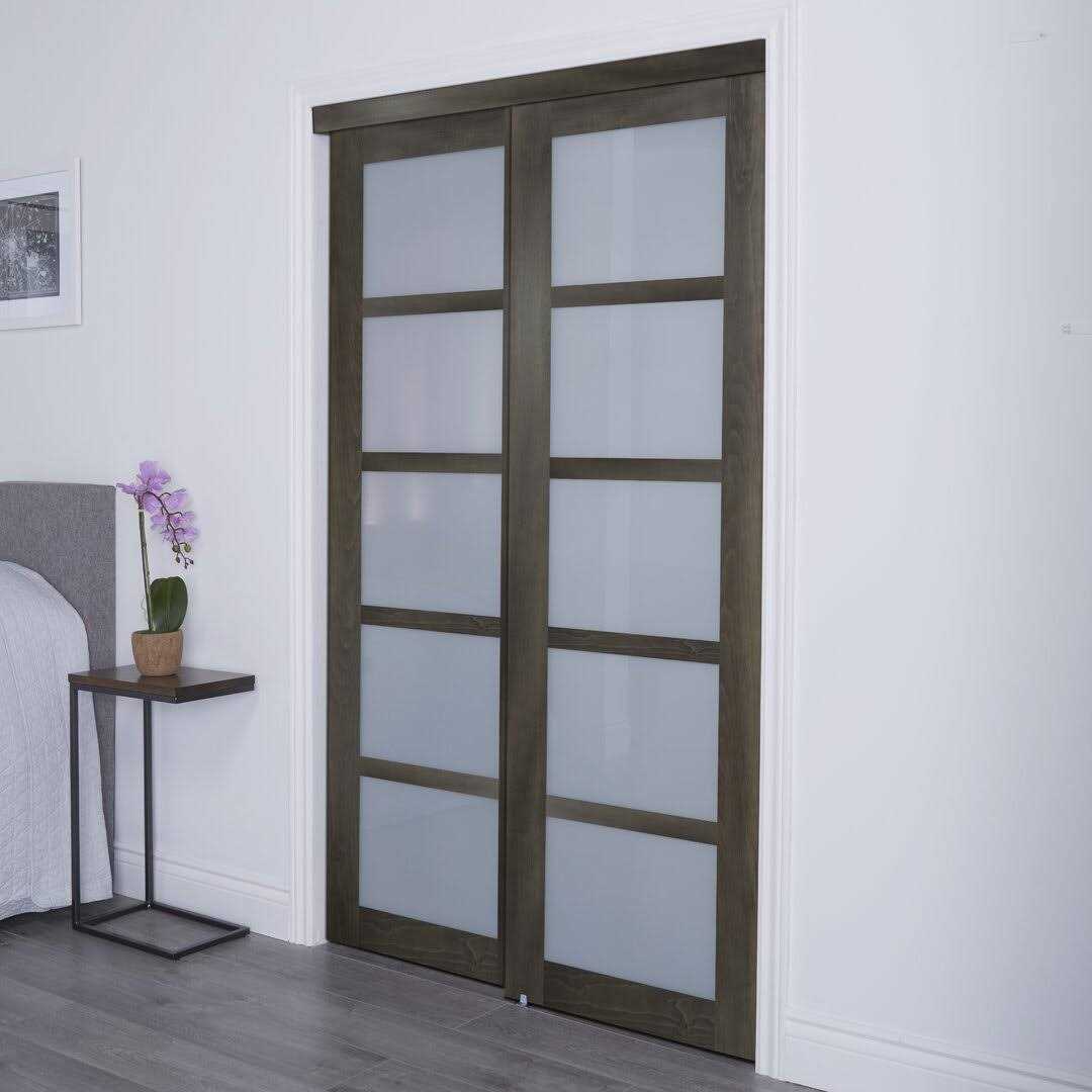Featuring five frosted glass inserts and Iron Age finished framing, these Italian-designed 5-lite sliding bypass closet doors add light and openness to any room without sacrificing privacy. The sliding closet doors are constructed of solid engineered wood with a smooth wood grain look. Whether you install them on a closet, in a hallway or between rooms, these doors can scale to the task with two panels for smaller openings or four panels for more expansive ones.