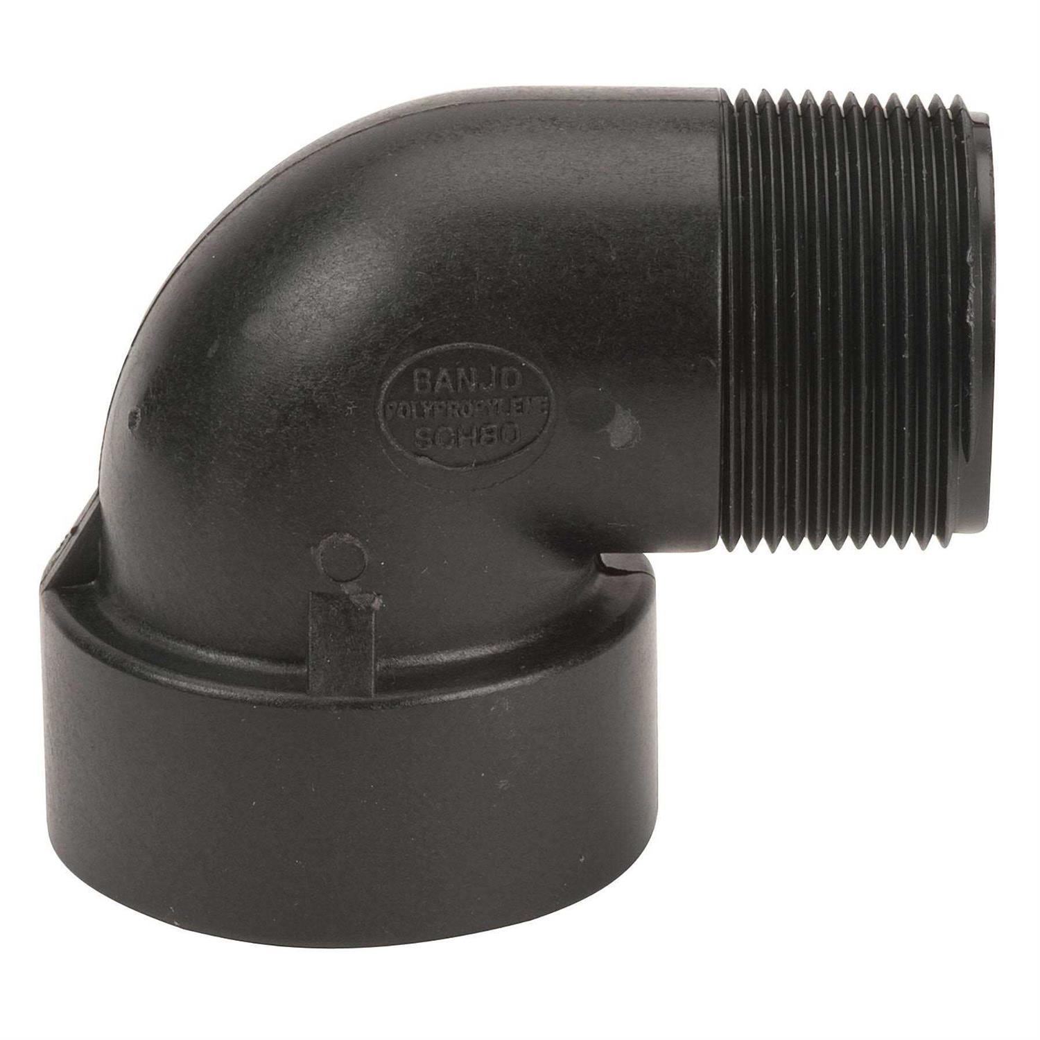 The 90-degree street elbow fitting, or “street ell,” connects two pipes, one with a male end and the other with a female end, at a 90-degree angle to change the direction of flow between pipes. It has male National Pipe Taper (NPT) threads on one end and female NPT threads on the other for connecting to a female and a male threaded pipe or fitting. The NPT threads create a tighter seal than straight threads. This fitting is precision molded in polypropylene, which resists most chemicals, has excellent dimensional stability, and is sterilizable. In addition, it is reinforced with fiberglass for added durability, strength, and chemical resistance. The fitting is suitable for handling pressures up to 150 pounds per square inch (psi) at 70 degrees F. This schedule 80 (thick wall) fitting is suitable for higher pressure than a schedule 40 fitting. This fitting is suitable for use in a wide variety of liquid handling applications including, but not limited to, fertilizers, industrial chemicals, pharmaceuticals, textiles, and water treatment.Pipe fittings are components used for connecting, terminating, controlling flow, and changing the direction of piping in many different industries. When purchasing pipe fittings, consider the application, as this will affect material type, shape, size, and required durability. Fittings are available threaded or unthreaded, in many shapes, styles, sizes, and schedules (pipe wall thickness). Banjo manufactures valves, couplings, pumps, pipe and hose fittings, and other fluid handling products for industrial applications. The company, founded in 1995, is headquartered in Crawfordsville, IN.