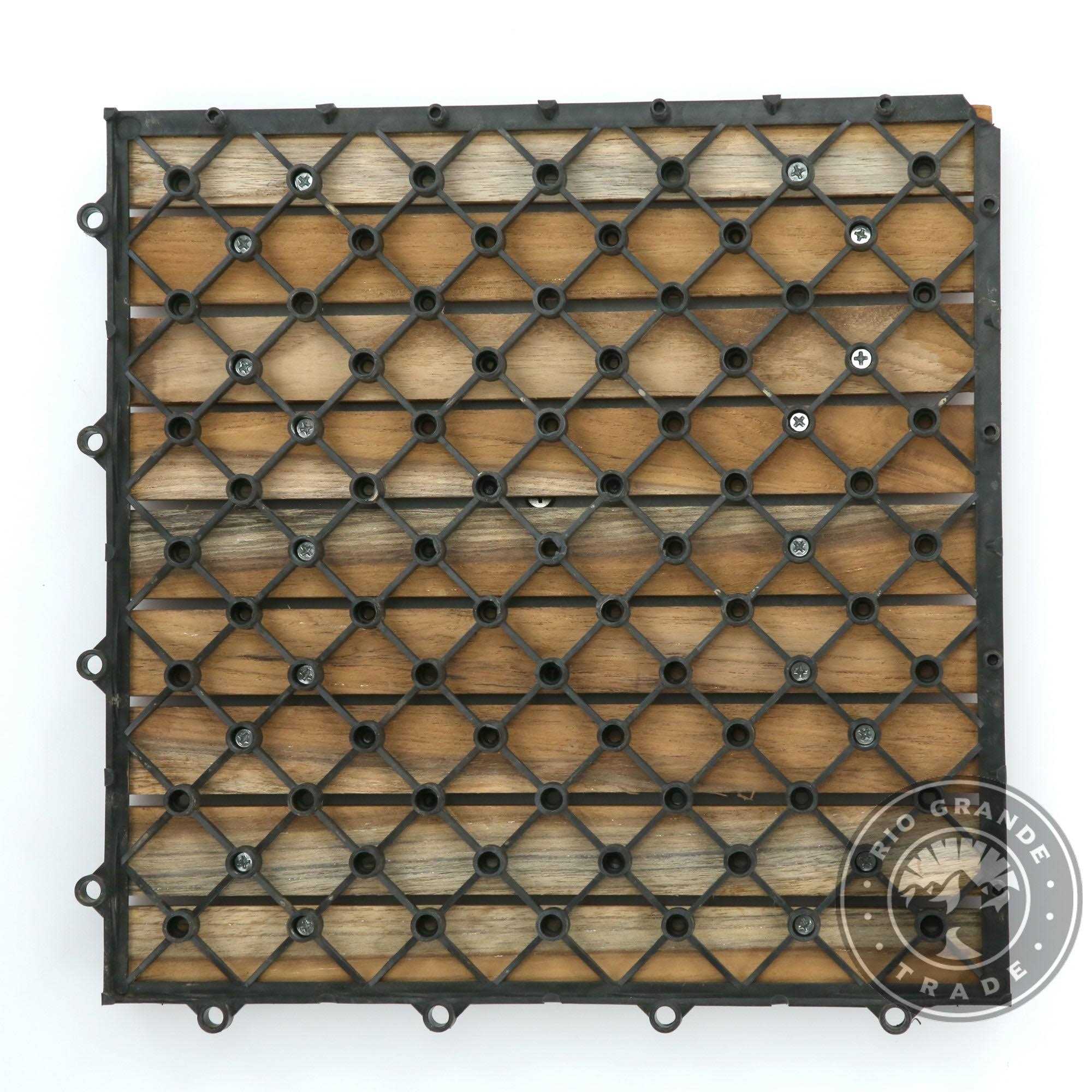 Bring new life to floors with these solid oiled teak wood flooring tiles that stand up to the elements. Interlocking components let you install each tile without need of tools or glue, while rotation capability allows you to move and reinstall tiles as you require. Just snap each tile in place, and enjoy your new floor. Each tile consists of a sturdy plastic base beneath nine solid pieces of oiled teak wood.