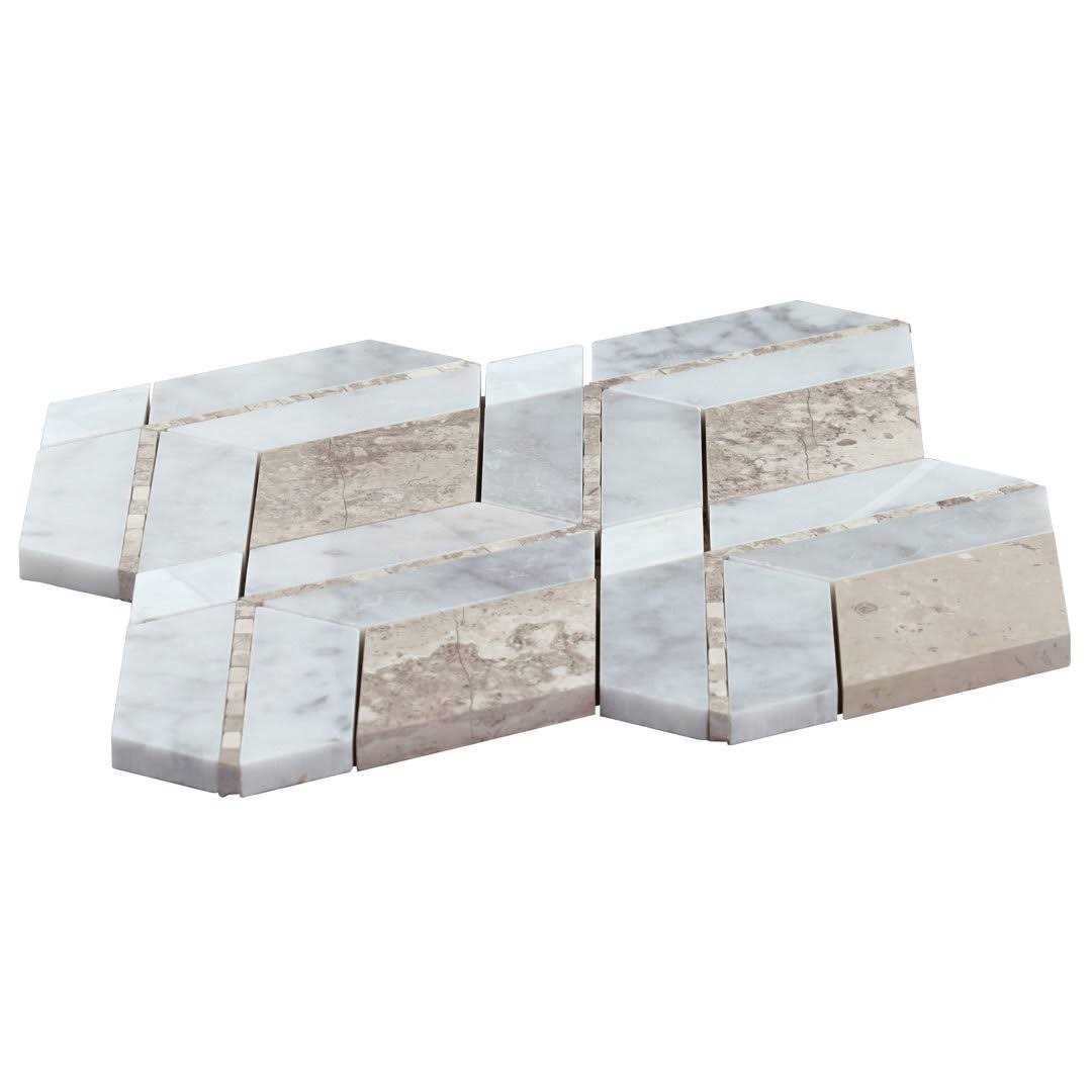 Marble weds mother-of-pearl. Discover the timeless beauty of complementary stones in the alluring Spencer mosaic collection. It’s a perfect match: cool, classic marble in four colorways and shimmery mother-of-pearl. The Art Deco-inspired diamond design adds glamour to any space. Spencer is available in a 10-inch by 10-inch mosaic sheet.