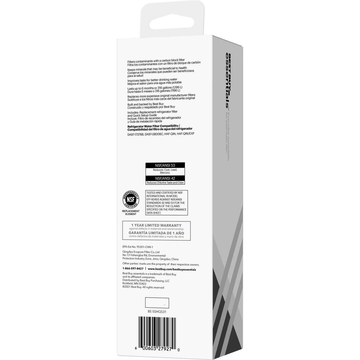 When looking to improve your health, start with the water you drink. This carbon block filter removes contaminants from your drinking water, including chlorine, cysts, lead, mercury, carbofuran, benzene, endrin and more. At the same time, it keeps minerals in your water which may be beneficial to your health. Tested and certified against NSF/ANSI standards 42 and 53, the filter also makes your water taste fresh and clean for up to six months or 316 gallons (1,196 L). This Best Buy essentials filter is a cheaper choice than expensive manufacturer brands. And it’s backed by Best Buy, so you can trust that your family’s water is safe. It’s easy to install and includes instructions to guide you. Enjoy great-tasking drinking water with the Best Buy essentials BE-SSHQ531 NSF 42/53 Water Filter Replacement for Select Samsung Refrigerators.