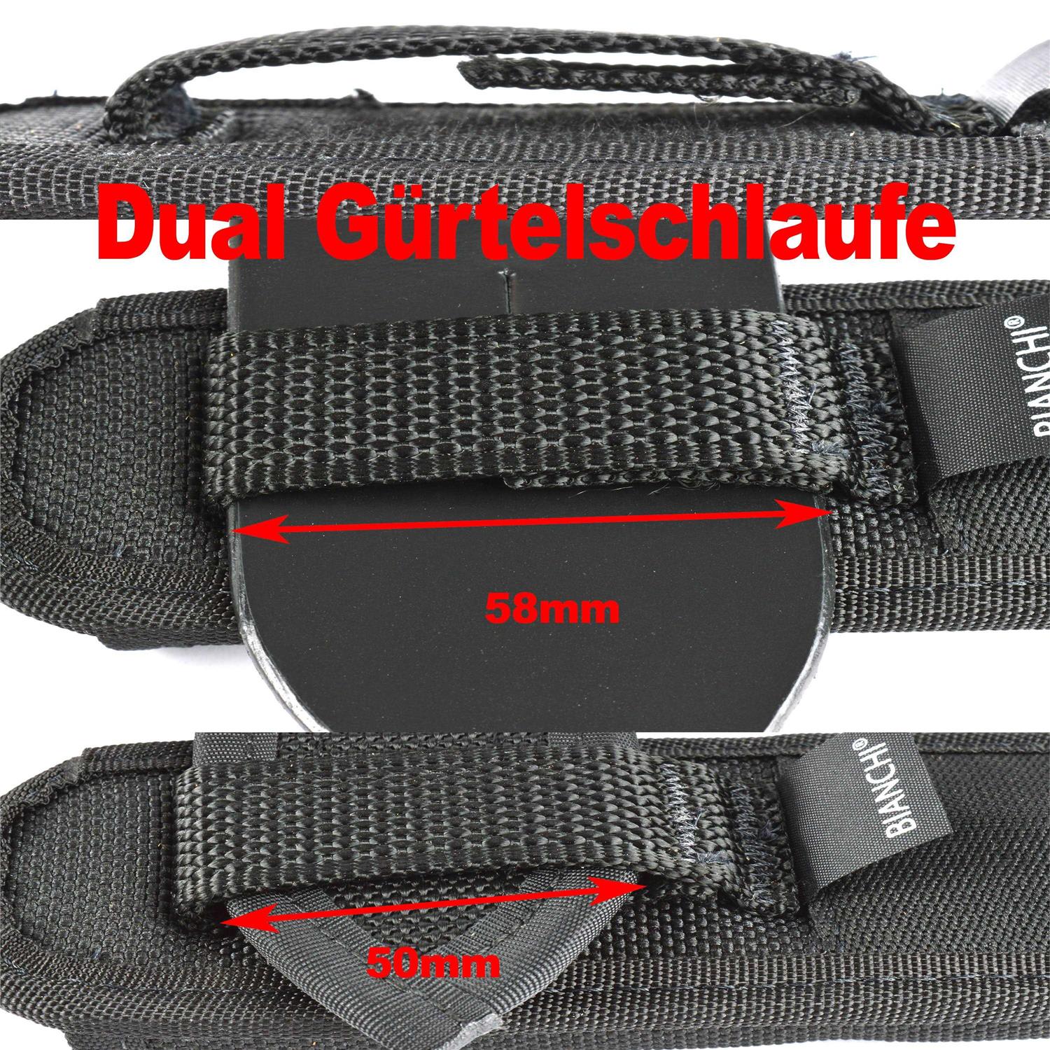 - Dual web belt loop design accommodates both 2″ (50mm) and 2.25″ (58mm) belts