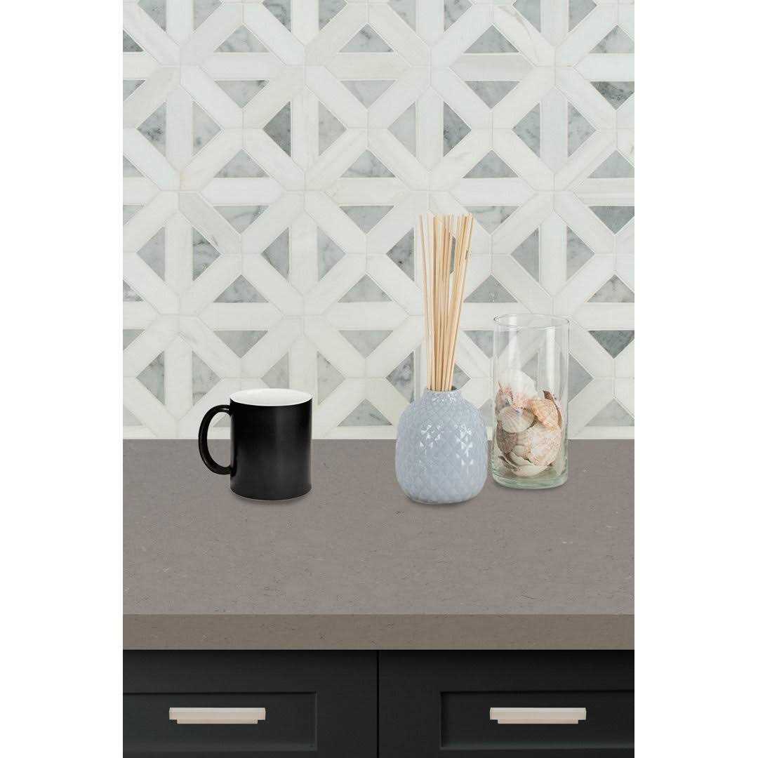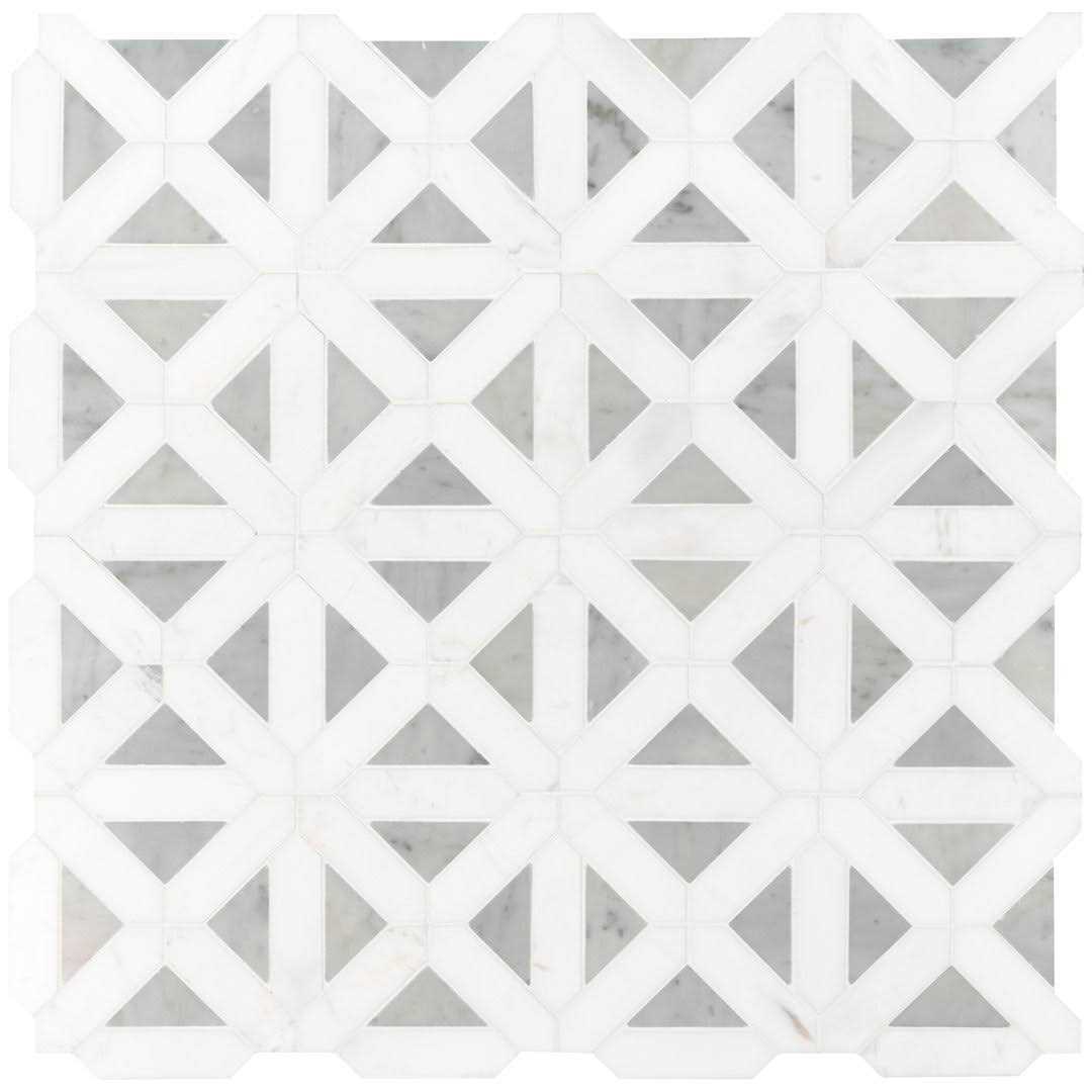 Bianco Dolomite Geometrica natural marble tile takes the timeless natural marble and crafts it into a contemporary pattern, creating a simply stunning combination. These gorgeous tiles are recommended for a wide range of design installations and are suitable to use as both backsplash tile and floor & wall tile. Features a distinct white and grey pattern with a polished finish Made for use on residential and commercial walls Grade 1, natural marble mosaic for floor, wall and countertop use MSIs Bianco Dolomite Geometrica Polished Patterned Mosaic Tile is classic a Turkish marble with a modern edge featuring distinctive, smooth grey veining. Its ideal for creating beautiful kitchen backsplash, shower surrounds, accent walls and other design features throughout homes and light use commercial properties. The timeless shape and color of this patterned marble mosaic make it exceedingly versatile complementing traditional to contemporary design styles. Pair it with a Bianco Dolomite countertop or other mosaics from the collection for a style-savvy cohesive look or use it alone to add a touch of unexpected detail and interest to any space. Tiles are prearranged on 12 in. x 12 in. mesh-backed sheets for simplified installation and coordinating moldings give your project a professional look.