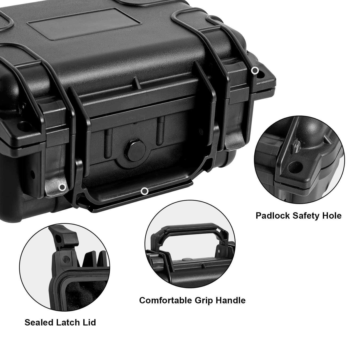 Toolbox is made of uv‐resistant and shockproof plastic construction. Crush proof hard shell case has the highest safety protection standards Multi-purpose Storage Organzier and Tool Box is made of a hard plastic that has enough protection to protect tools or important items Equipped with standard pressure balance valve can release interior pressure and an O-ring seal can block the entry of water and dust effectively in normal pressure Small waterproof hard case inner provide a customized cushion foam to be adjusted according to your tools. Lid is lined with grooved texture foam to keep your valuable items safety from shock and bumps Exterior Dimensions: 9.2″ x 8″ x 4.8″, Interior Dimensions: 8.07″ x 5.51″ x 4.2″, Lid Depth: 1.34″, Base Depth: 2.56″