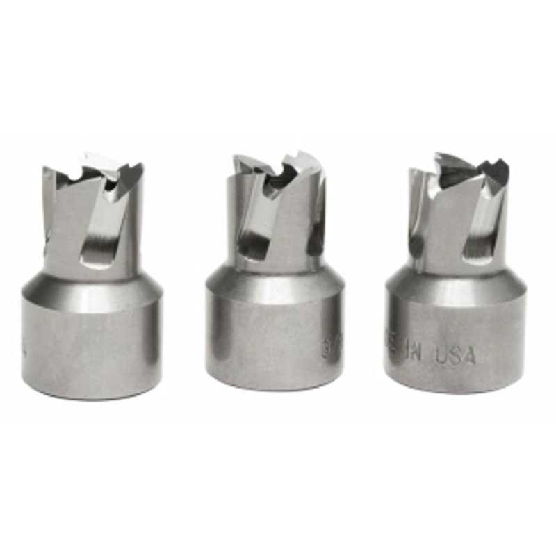 Rotabroach Annular tools cut clean, burr-free, round holes fast, unlike twist drills that push or hole saws that tear thru materials. Because they’re hollow, they cut around the edge of the hole, so less work is required and no deforming of material or jagged edges occur. Multiple cutting teeth are precision ground instead of stamped like hole saws, give long tool life.Rotabroach Cutters are for precision hole making in sheet metal, frame materials, and plate stock up to ½” thick, whether Mild Steel, Stainless Steel, or Aluminum. These are the same tools as those used by OEMs on assembly lines for access holes and accessory equipment installations. For body shops and frame straighteners, custom building and detailing, aftermarket installations, rust proofers and under coaters – wherever fast, rugged, and superior quality holes are required – Rotabroach Cutters are the single answer. Patented tooth geometry also prevents chip clogging when cutting steel, sheet metal, or plastics.Arbors fit 3/8″ and 1/2″ hand held drill chucks and use either spring loaded pilots or skip-proof pilots which eliminate pre-drilling operations.