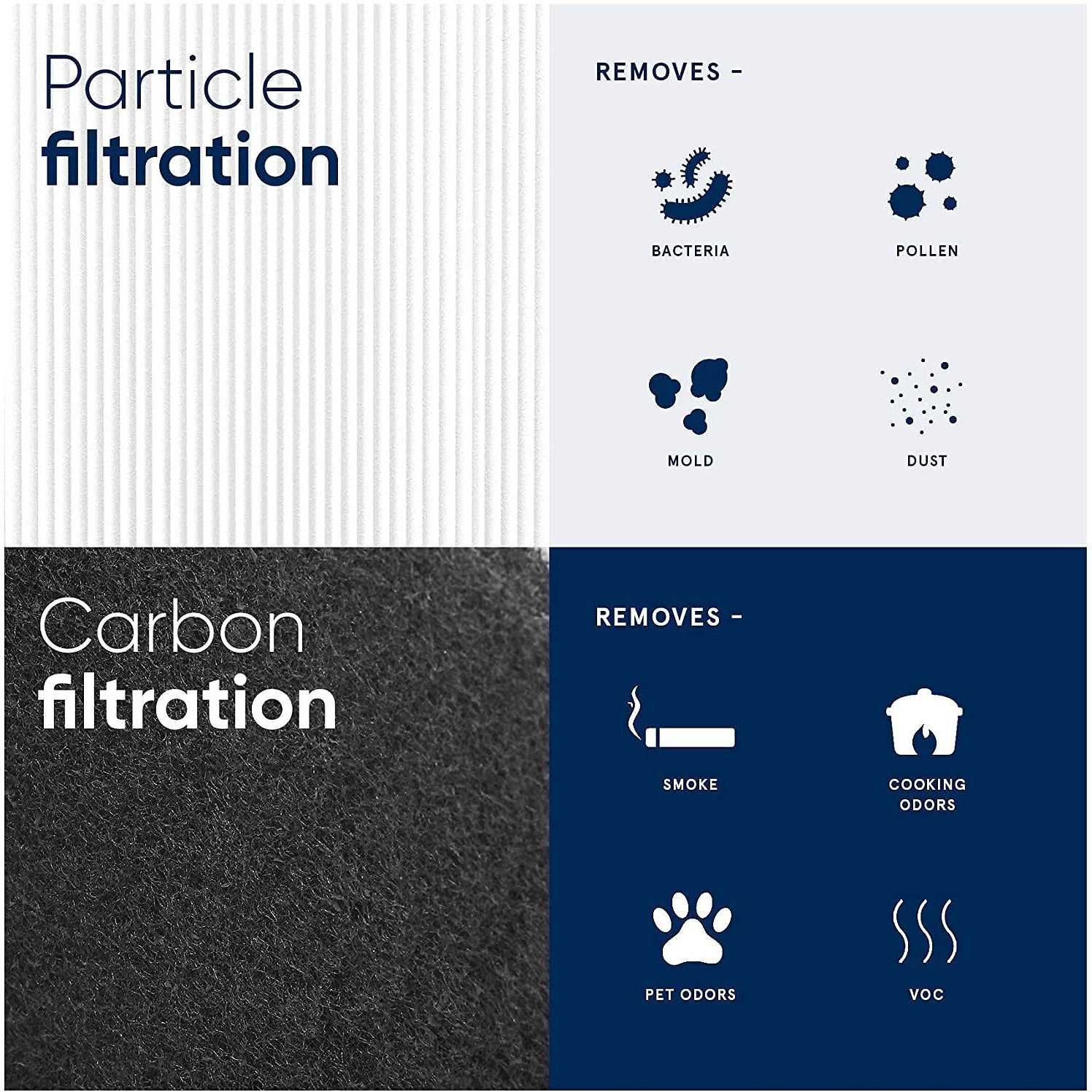 - Activated carbon mesh traps odors, smoke, chemicals, and volatile organic compounds.