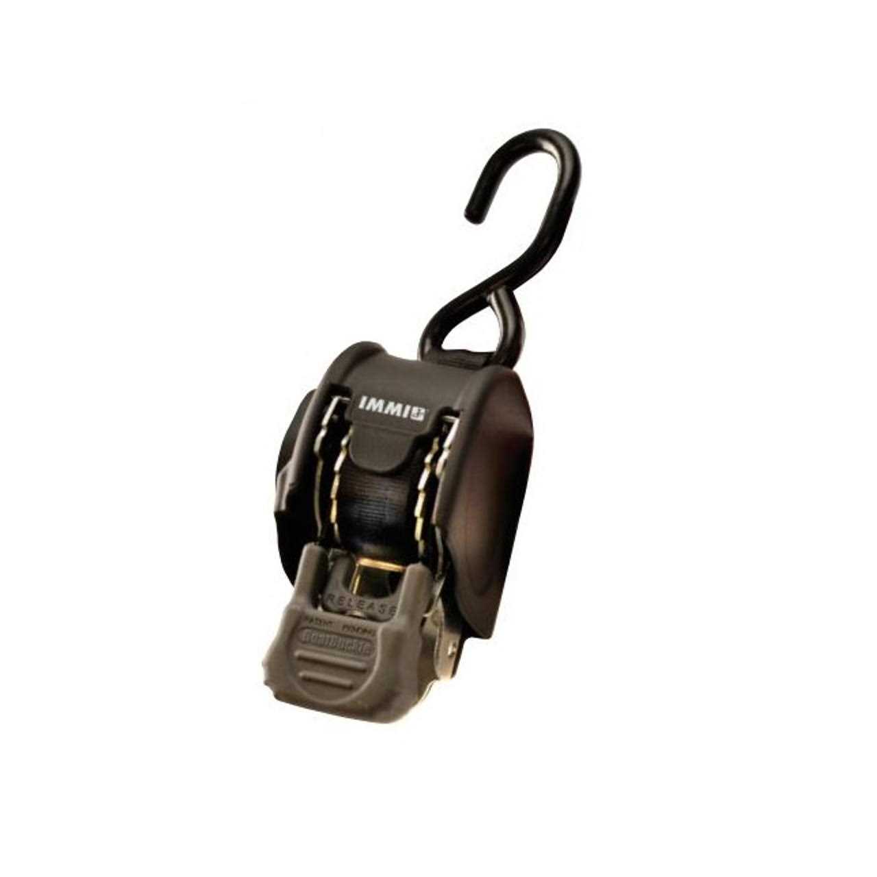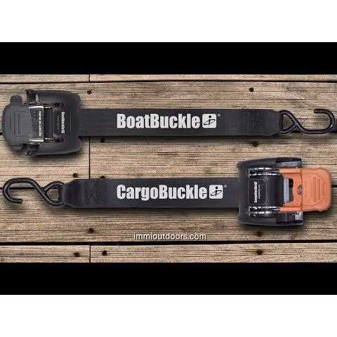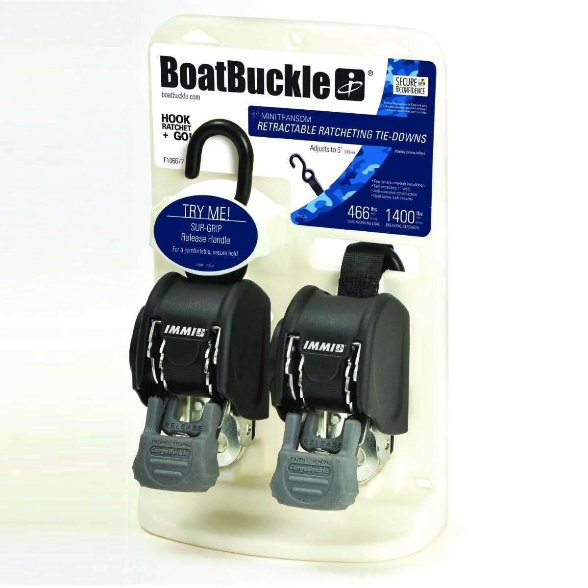 Retractable transom tie-down system for boats Each buckle has 1,400-pound breaking strength and 466 pounds safe working load Buckle automatically retracts to hold the boat snug to the trailer Permanent one-bolt installation; 1-inch seat belt quality polyester web Self-ratcheting; simple, one-hand operation The Mini G3 Transom tie-down can be permanently mounted with one bolt to most boat trailers. Six feet of one-inch webbing enables you to Tie-Down more equipment in more applications, conveniently and securely. It features permanent one-bolt installation, self-retracting web, and anti-corrosive construction. The one-inch web is made from high-quality polyester and measures 72 inches. The buckle has dual safety-lock security with a break strength of 1,400 pounds and a 466-pound safe working load. BoatBuckle brand tie-down systems offer professional fishermen and weekend boaters convenient, high quality tie-down systems so they can spend more time on the water and less time on the boat ramp. IMMI is the leading marine tie-down manufacturer in North America.