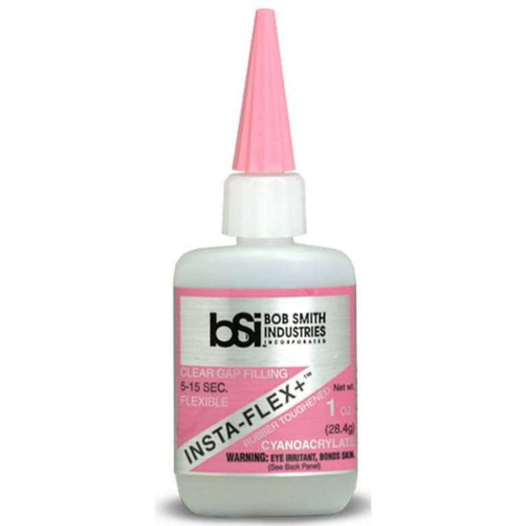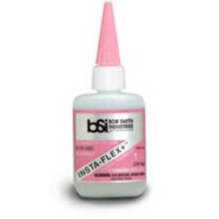 This is a one ounce bottle of Bob Smith Industries INSTA-FLEX+ Clear Rubber Toughened CA Glue. INSTA-FLEX+ clear rubber toughened has similar qualities to our black IC-2000 but can be used in applications where you do not want the adhesive to be seen. The carbon component of IC-2000 that gives the CA its black color also contributes to its unsurpassed strength. Since INSTA-FLEX+ has this carbon removed, its strength is a little less than IC-2000 but still superior to standard CA’s. When esthetics are important and a flexible bond is required, INSTA-FLEX+ is your best choice. It forms superior bonds to soft urethane and vinyl plastics. Both INSTA-FLEX and INSTA-FLEX+ work well when bonding R/C car tires. When a joint has a larger than normal gap, flexible CA’s provide superior shock resistant bonds.