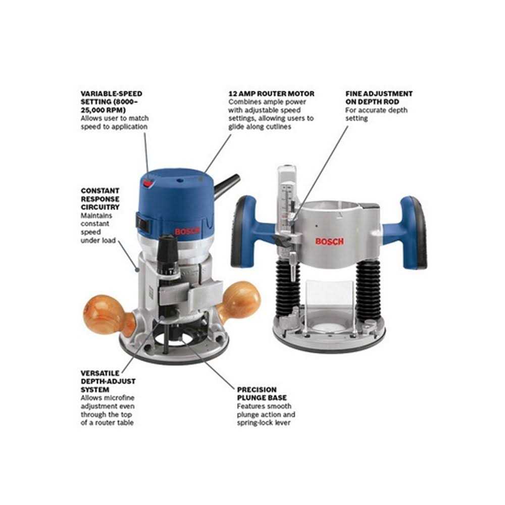 The Bosch 1617EVSPK gives you the best of both the fixed-base and plunge router worlds. This kit features the exclusive quick-clamp system, allowing tool-free movement of motor from base to base. Other key features include variable speed, soft-start, and Constant Response circuitry that maintains speed under load. The depth adjustment system features coarse and microfine bit depth adjustment with re-settable indicators. Both bases have large base openings with 2 In. sub-base openings, accepting larger bits and providing better visibility. The routers’ right or left switch and cord locations provide both choice and consistency, and the motor does not rotate during depth adjustment. Both bases feature the Bosch exclusive precision centering design for centering optional template guides. The motor has a one-piece armature shaft for accuracy and long bit shank capacity. The kit includes 1/2 In. and 1/4 In. self-releasing collets, and comfortable drop-forged wrenches. The many optional Bosch router attachments allow you to build a complete routing system.