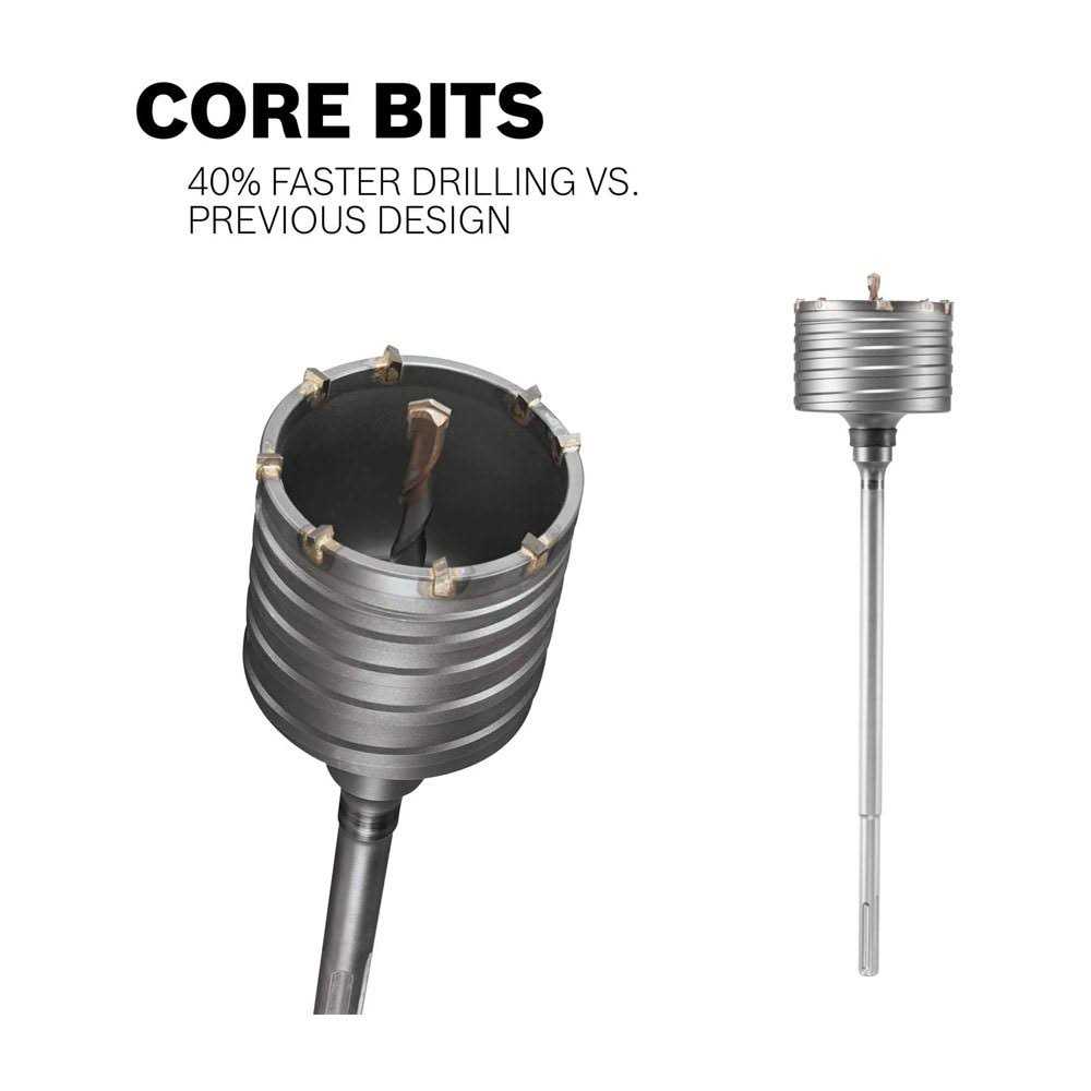Bosch SDS-max carbide-tipped rotary hammer core bits offer an integral shank for better power transmission. Bosch SDS-max rotary hammer core bits with wave design go beyond the range of standard bits and allow smaller hammers to drill larger holes. Wave design transfers energy to bit more effectively for up to 40 percent faster drilling versus previous design.