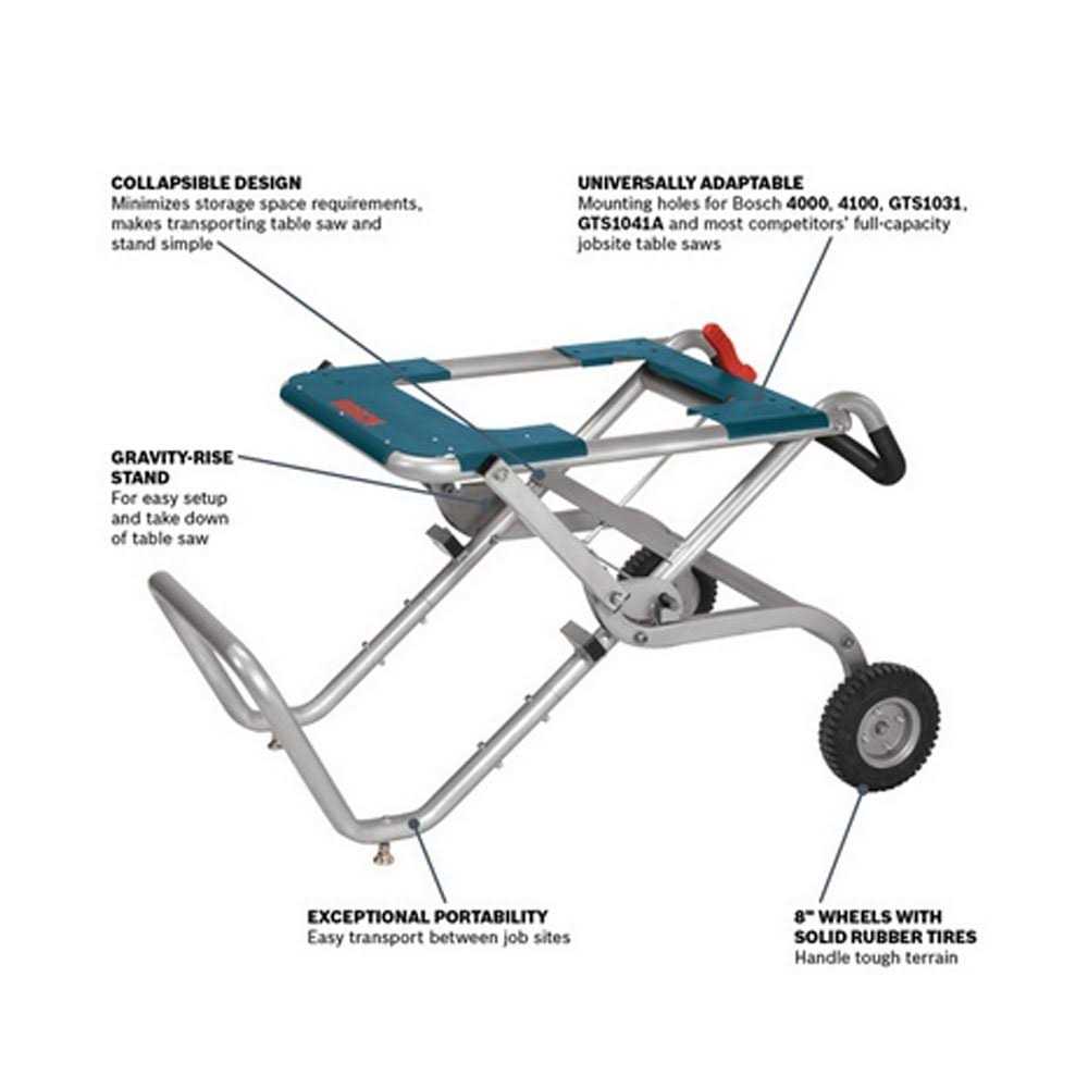 Take the back-ache out of setting up and breaking down your table saw with the revolutionary new Gravity-Rise wheeled saw stand from Bosch. Designed for general contractors, trim carpenters, woodworkers and remodeler, the Bosch TS2000 gravity-rise stand is a rugged, portable, and, best of all, easy-to-use. Setup is a snap! Simply turn the release lever, put your hand on the tabletop, and the stand raises and lowers relative to your hand pressure so that you can find just the right height for your tired back. Constructed of heavy gauge tubular steel, the gravity-rise stand is built to withstand the toughest jobsites. Eight- In. treaded pneumatic wheels easily handle rough terrain and make tool transport nearly effortless. The gravity-rise is equipped with universal mounting slots, which are designed to accommodate most major manufacturers’ portable table saws.