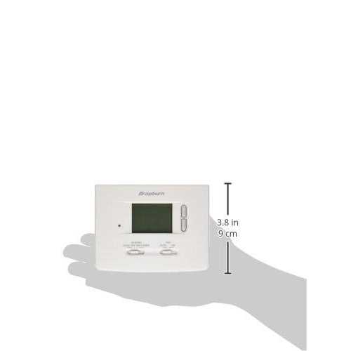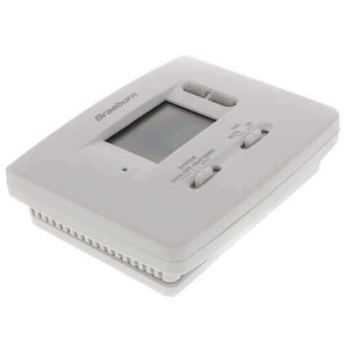 The digital non-programmable thermostat shall be a Braeburn1220NC number 1220NC, 3.62” high x 4.72” wide x 1.38” deep, powered independently with either 24 vac or two “aa” alkaline batteries (3.0 volt dc). the thermostat shall be compatible with multi-stage conventional or heat pump systems with up to two stages of heating and one stage of cooling and heat pump systems with one compressor and up to one auxiliary stage. The thermostat shall have a bright blue backlight display and separate sub-base for trouble free installation. Temperature control range shall be between 45° and 90° F (7° and 32° c), accuracy of +/- 1° F (+/- .5° c), humidity range between 5% and 95% relative humidity. The thermostat shall include non-volatile memory to retain user settings, adjustable temperature limits and auxiliary heat indicator. Thermostat shall have low battery indication and a front reset button will return user settings to default values when pressed. The thermostat can be mounted to a horizontal junction box.
