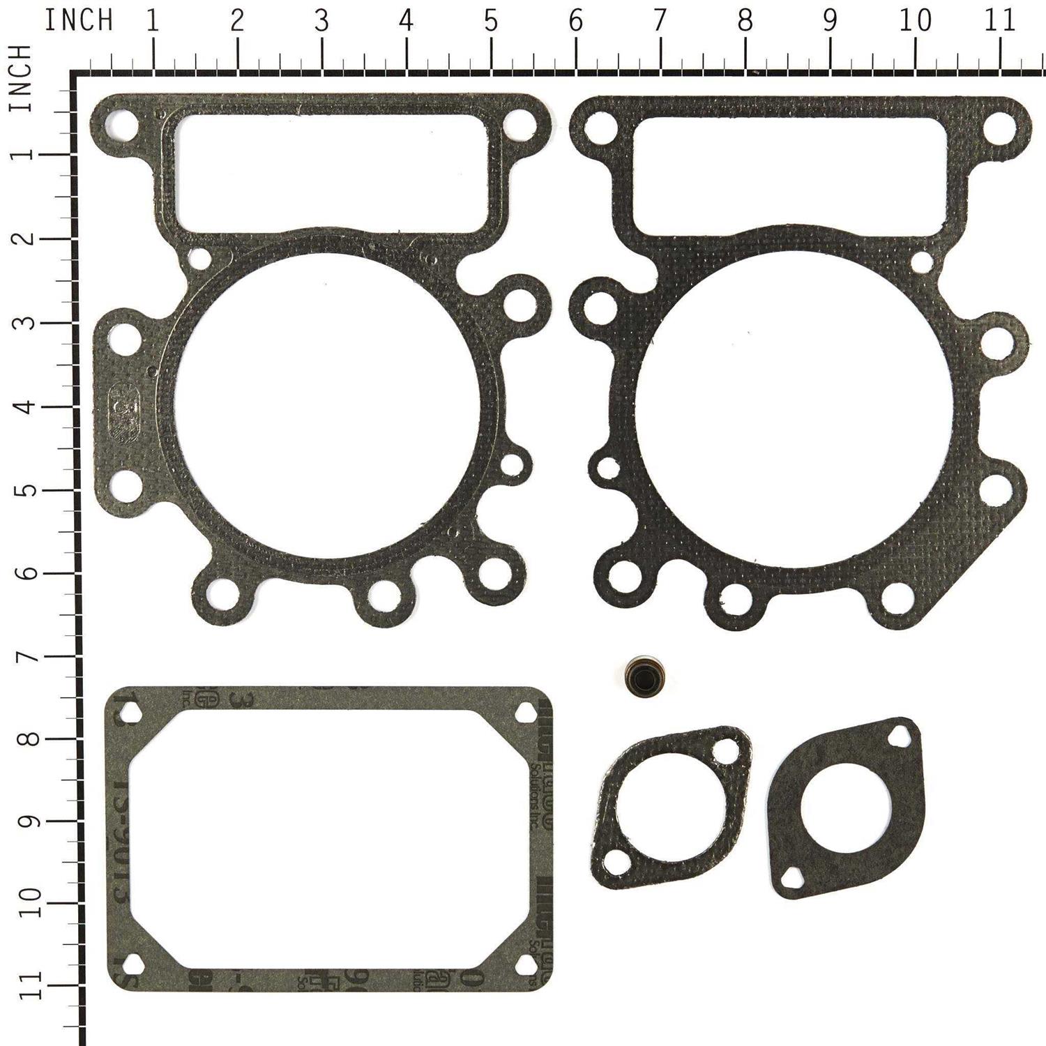 This gasket set-valve is supplied by the original equipment manufacturer for use with Briggs and Stratton engines commonly installed on lawn and garden equipment. It helps to distribute the pressure evenly and provide an air-tight seal for the cylinder head. Over time components may wear out and begin to crack eventually requiring replacements. For the exact locations and the correct applications, please refer to the appropriate diagrams of your model. This high-quality set includes five composite material gaskets and one valve seal. You will need a wrench set to remove and reattach the cylinder head to perform this repair. This Gasket is used in s, Engines, and Lawn Tractors.