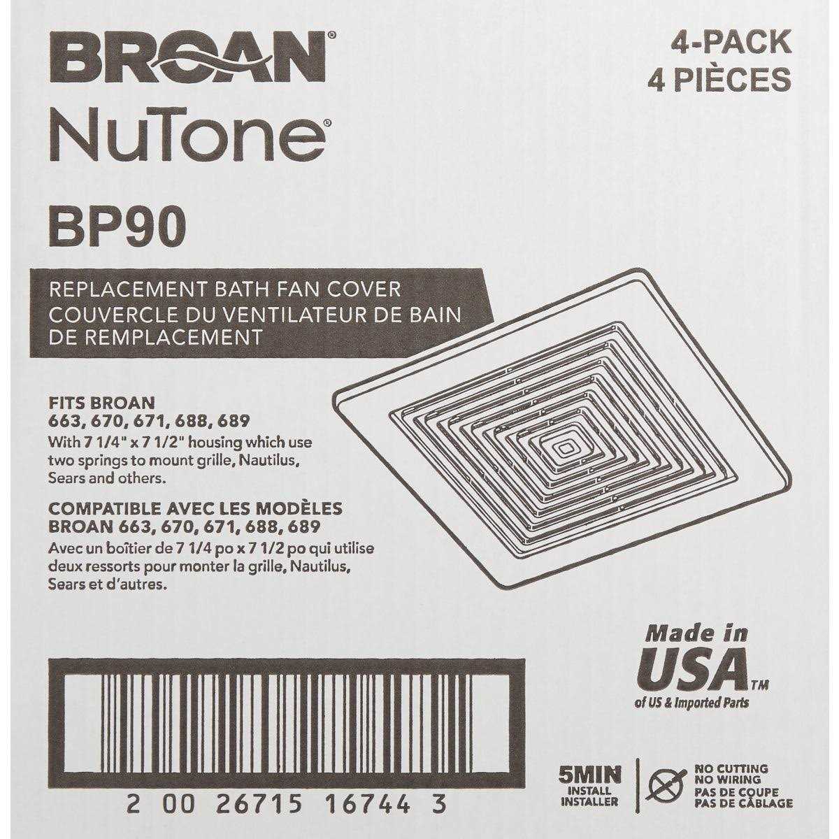 Upgrade with ease with this replacement grille! The Broan-NuTone BP90 grille replaces the Broan 688 exhaust fan (HDs 255325) and is also suitable for use with vent fan models 670, 671, 688, and 689. It’s additionally compatible with smaller Broan and NuTone fans featuring housings measuring 7-1/8 x 7-1/4 inches. Replacing or installing this grille is a straightforward process, as it requires no modifications to drywall or ductwork. Furthermore, it has dimensions of 9.25 inches in length, 9 inches in width, and 0.375 inches in height.With a nearly century-long history of excellence, Broan-NuTone continues to lead the way in the residential ventilation market, delivering high-quality solutions. Seize the opportunity to purchase the Broan-NuTone BP90 today! For all your heating and cooling needs, don’t miss out on the deals available at PlumbersStock.