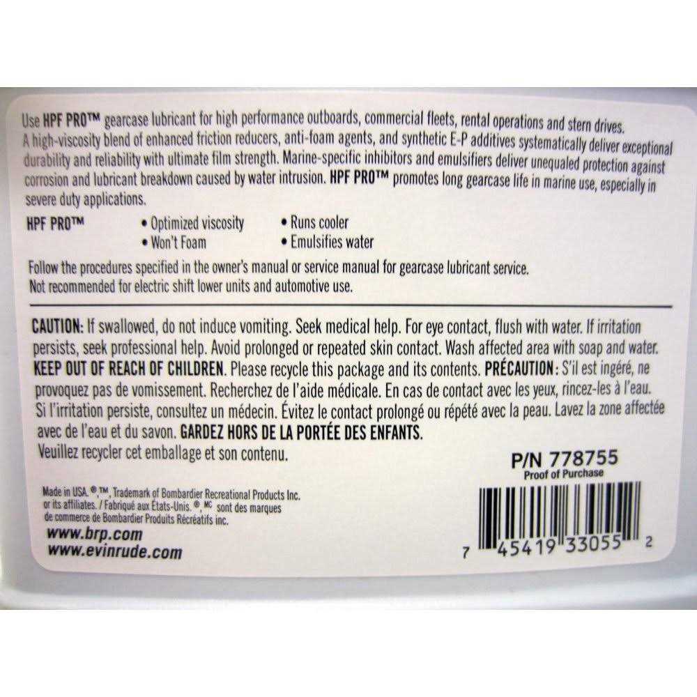 - HPF PRO is the factory fill gearcase lubricant for Evinrude E-TEC outboards