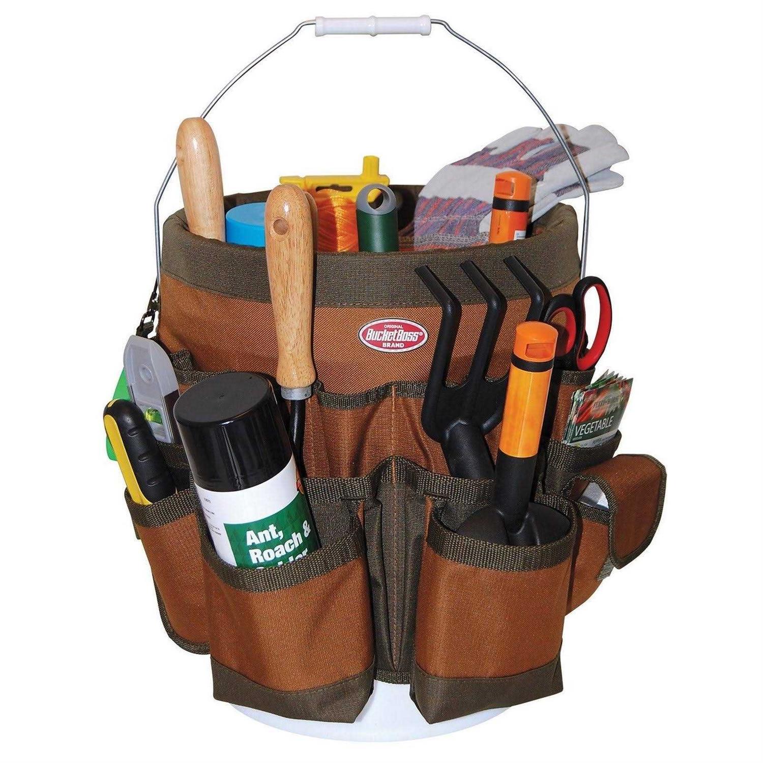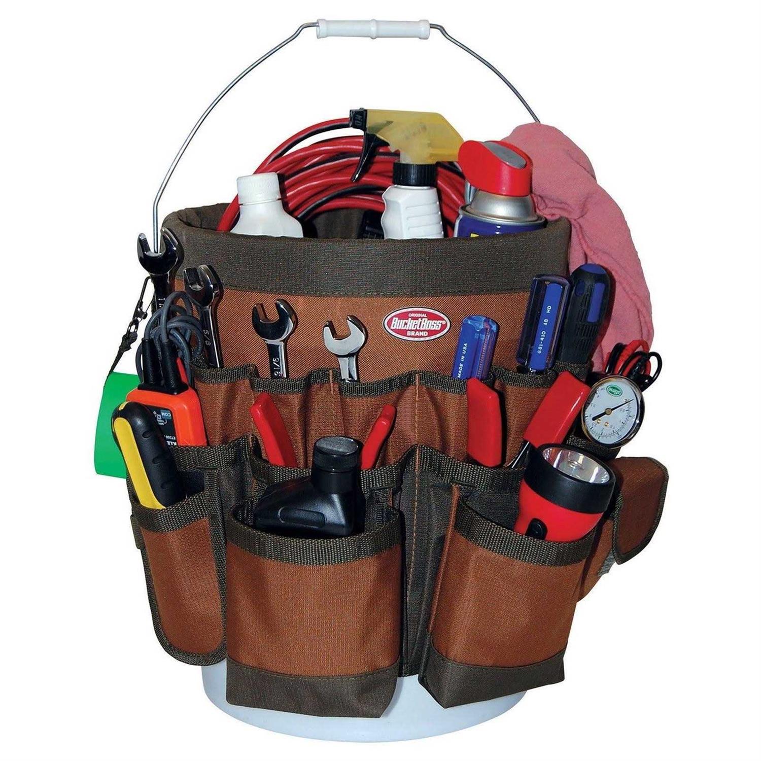 The Bucket Boss legacy began back in 1987, when two men working on a job site in Duluth, Minnesota found it easier to carry their tools in 5 Gal. buckets. They created the first ‘Bucket Boss’ organizer made of canvas that fit securely around their buckets. Today, Bucket Boss carries over 100 different products that organize and hold tools in the strongest, most efficient ways. For 30-years, we have prided ourselves in creating durable products that can withstand many-years of wear and tear. We strive to stay ahead of the pack by constantly upgrading features and using the best quality materials on the market to create the best product for our end users. The 56-Pocket Bucket Tool Organizer gives you the ability to hold plenty of your hand tools in a 5 Gal. bucket. Made of durable poly ripstop/600D poly material and built with 38 exterior and 18 interior pockets, fits any 5 Gal. bucket. There are also 3 interior loops for hammers, drills, pry bars and long tools. Bucket is not included. Color: Brown & Green.