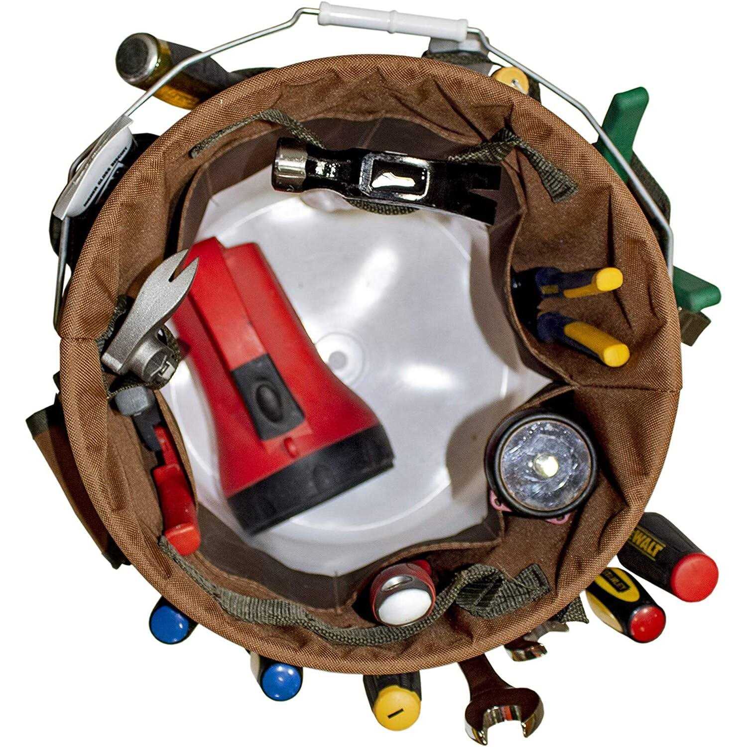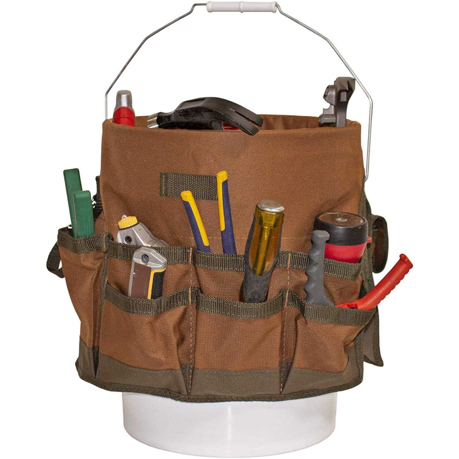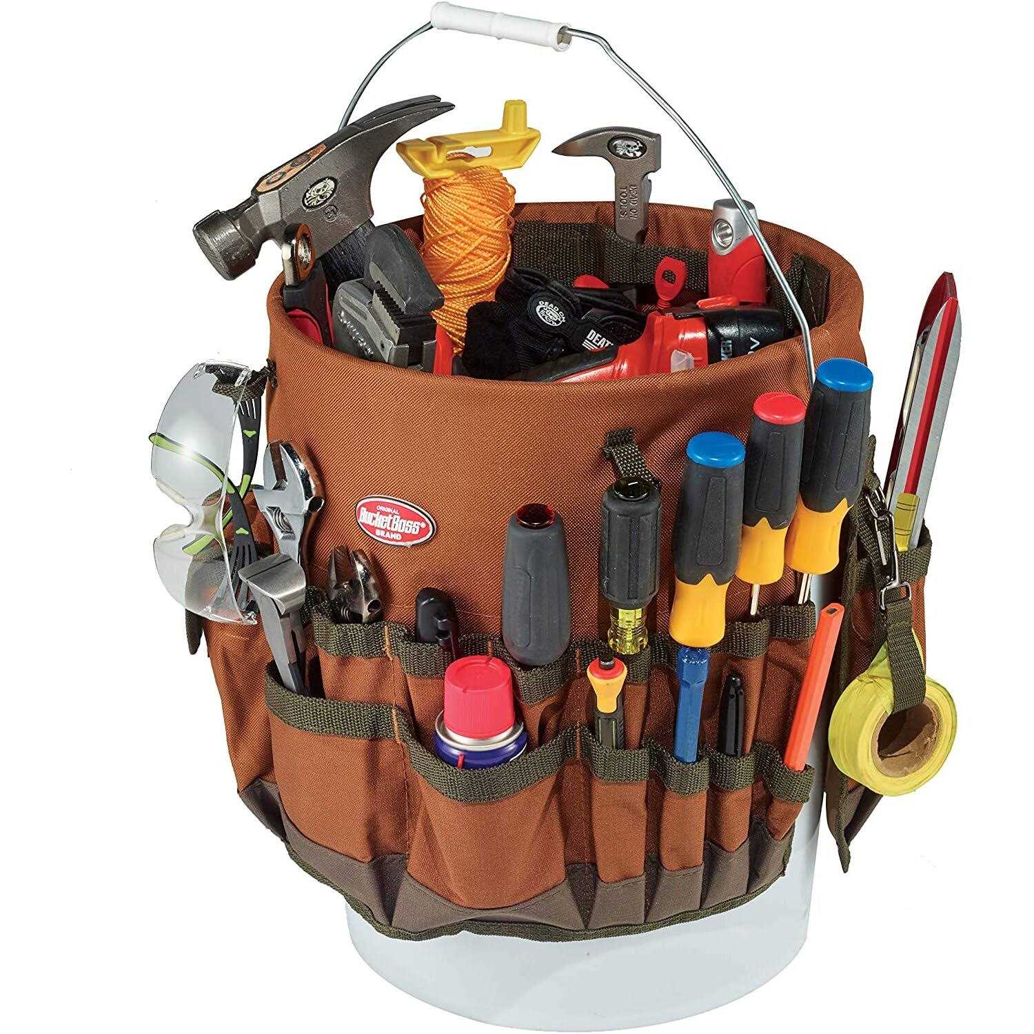 Bucket Boss The Bucketeer Bucket Tool Organizer in Brown, 10030 3 interior loops for hammers, drills, pry bars and other long-handled tools Fits most 5 gallon buckets Goes Where You Go: The Bucket Boss legacy began back in 1987, when two men working on a jobsite in Duluth, Minnesota found it easier to carry their tools in 5-gallon buckets. They created the first ‘Bucket Boss’ organizer made of canvas that fit securely around their buckets. Today, Bucket Boss carries over 100 different products that organize and hold tools in the strongest, most efficient ways. The world’s first bucket organizer, the original Bucket Boss. Fits any 5 gallon bucket, providing instant organization with 30 pockets for tools and 3 interior loops for hammers and pry bars, all while keeping the bucket center open for bulk storage. Made of durable 600 denier poly ripstop fabric.