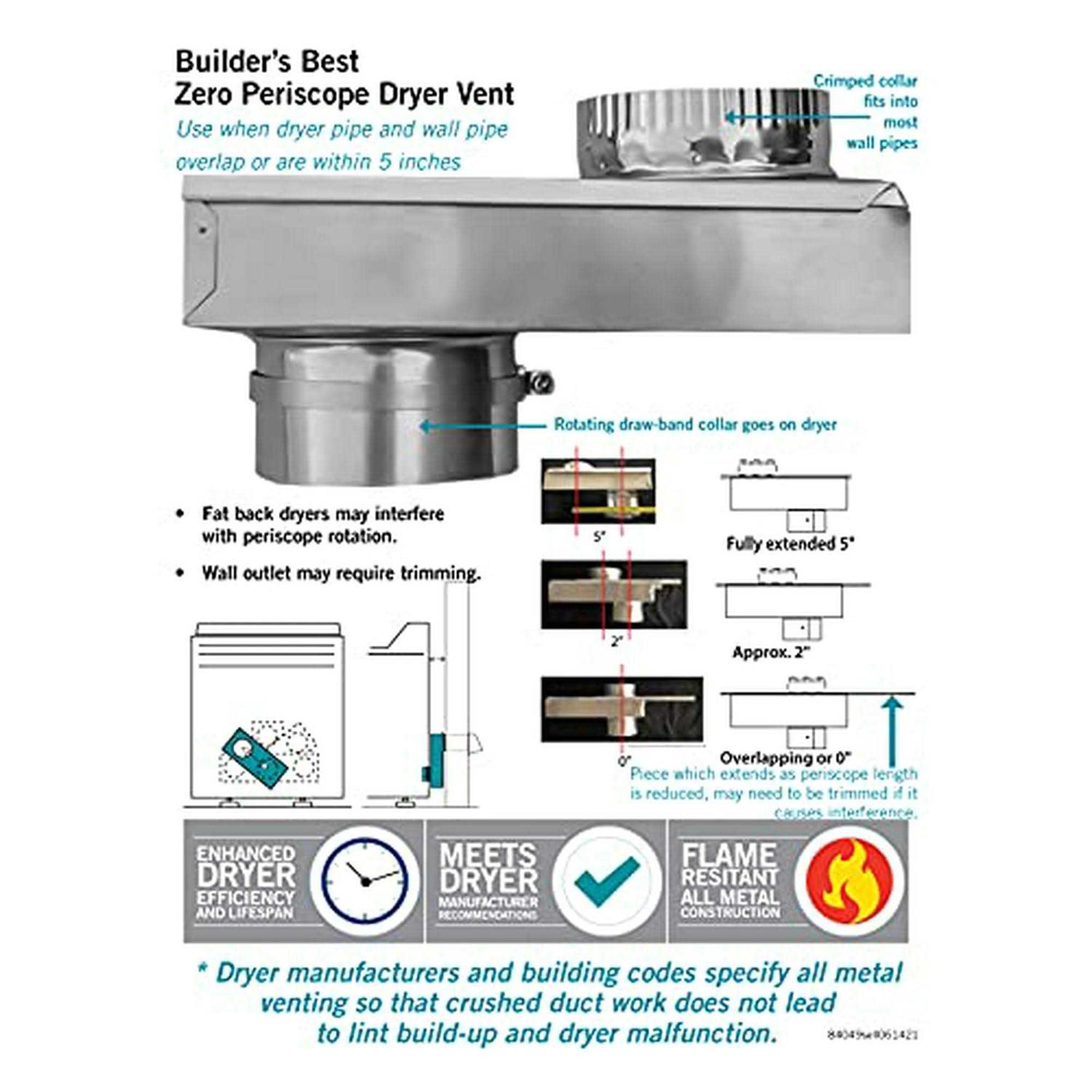 This 84049 Zero Periscope is specifically designed for use in situations where the dryer Outlet overlaps or is very close to the wall Outlet. The 2 inch by 6 inch smooth aluminium construction telescopes to handle outlets up to 5 inches distance from center to center. The 4 inch diameter draw band collar synchs down over the clothes dryer vent i. e. . The 4 inch diameter crimped fitting slides into most wall ies. Once installed, it needs only 2. 5 inches clearance behind the dryer. If your outlets are very close and you need to move the dryer closer to the wall, this vent maintains critical airflow and provides all metal performance. Clothes dryer manufacturers specify “only rigid or flexible metal vent shall be used for exhausting. Do not use plastic or metal foil vent. ” installation instructions are included inside each carton. The zero periscope is built in the USA by Builder’s Best.