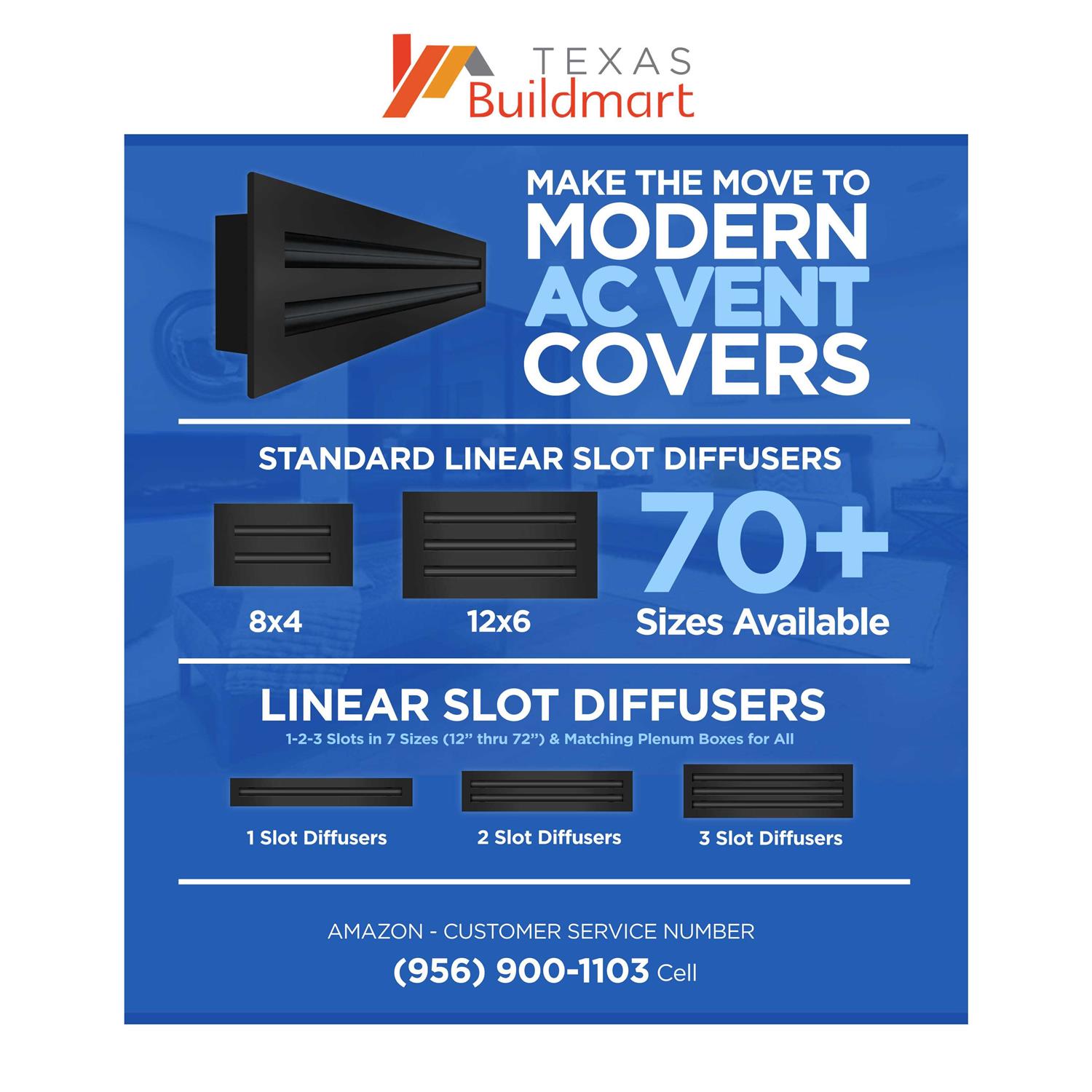 Texas Buildmart Texas Buildmart offers Modern AC Vent Covers also known as High Quality Standard Linear Slot Diffusers. This Modern AC Vent Cover shoots a 90-degree spread with option to adjust to one side or the other. These have decorative directional dampers. Modern, crisp, clean lines and architecturally appealing. Solid extruded aluminum profile with welding – Electrostatic Paint which makes it easy to clean because of it’s dust-resistance. This black air vent register can be used as a supply air vent cover for ceilings, walls, and floors, and as a return air vent covers register but looks like a Modern Contemporary looking fixture. If our Modern AC Vent Cover is used as a Return air vent cover, please make sure the air vent cover is placed in the full open position or remove the directional dampers. Update your Ceilings, Walls & Floor Vents with our Modern AC Vent Covers and it will update the entire look of your Home or Office Space. Rejillas para aire acondicionado de casa blanco.