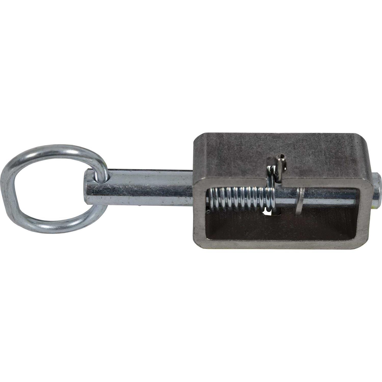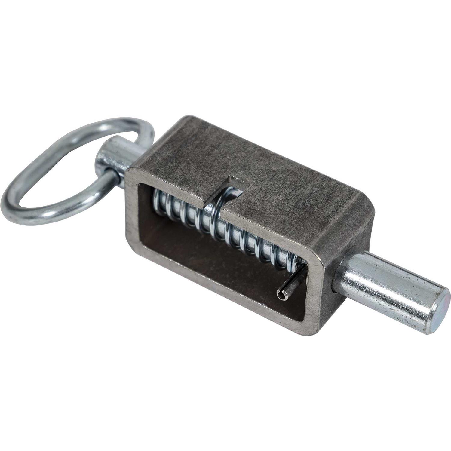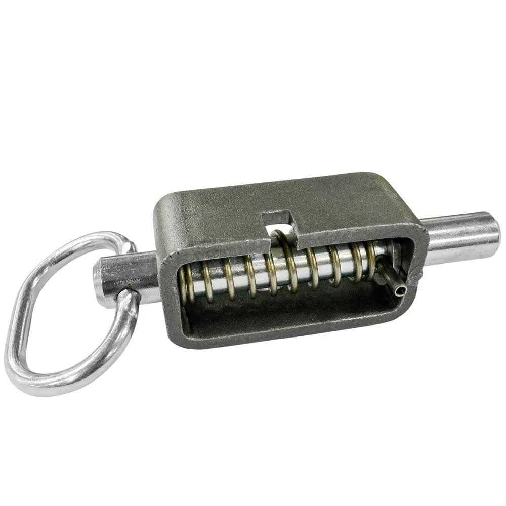 This spring latch assembly has a spring-loaded bolt that can be locked in an open position and a spring and spring pin made of stainless steel. It includes a tube and pin and is for use with trucks and trailers. Its pin diameter is 0.63 inches and its housing measures 3.00 length x 1.50 width x 1.25 inches height. Its bolt has a width of 0.62 inches and its pin measures 1.31 inches in length. Its handle length is 1.75 inches and it has a weld-on mount.