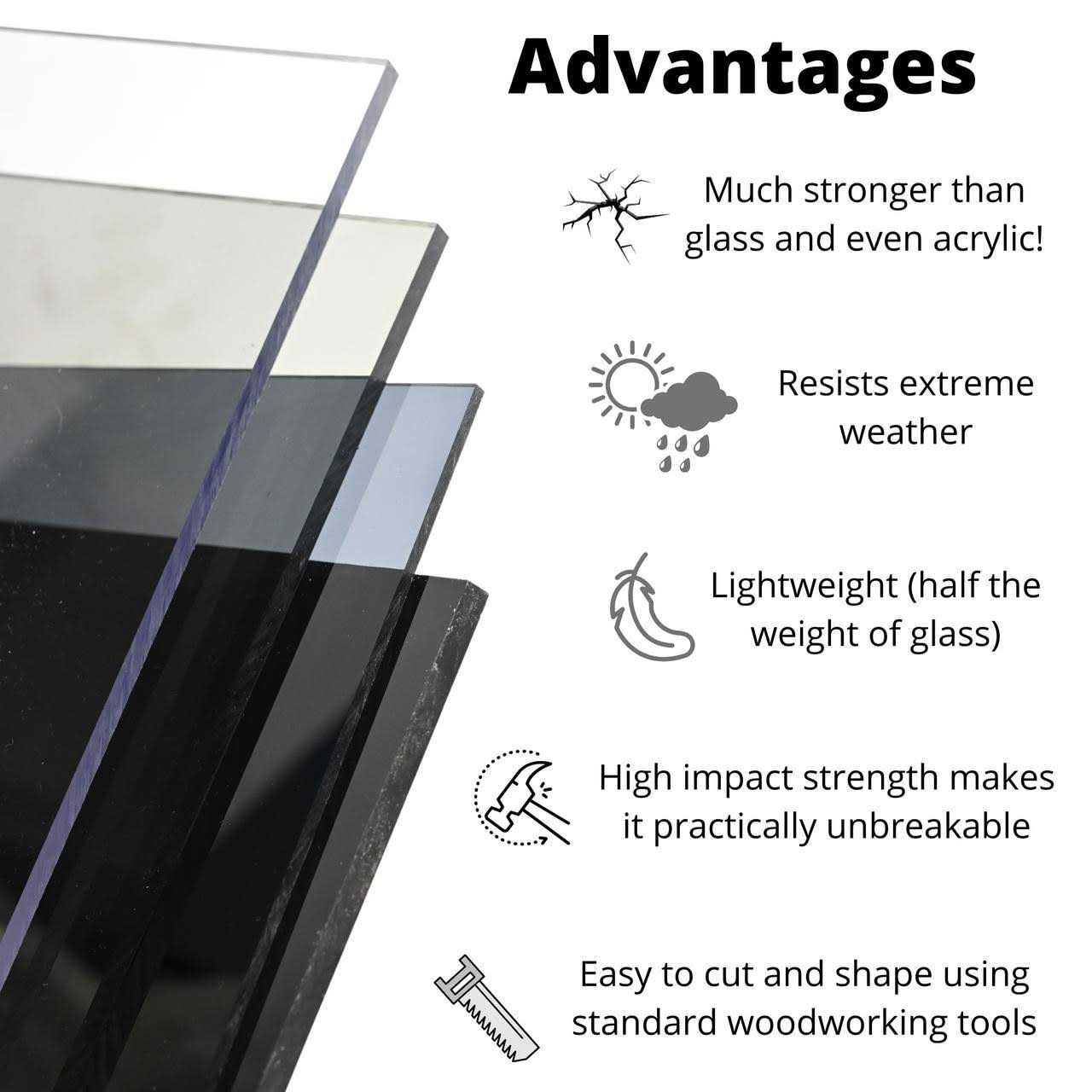Cut Tolerance +0 inch -.25 inch At only half the weight of glass, these polycarbonate sheets are often used for windows, machine guards, instrument gauge covers, and signs. It has greater impact strength than Plexiglas Acrylic and can be used in similar applications.