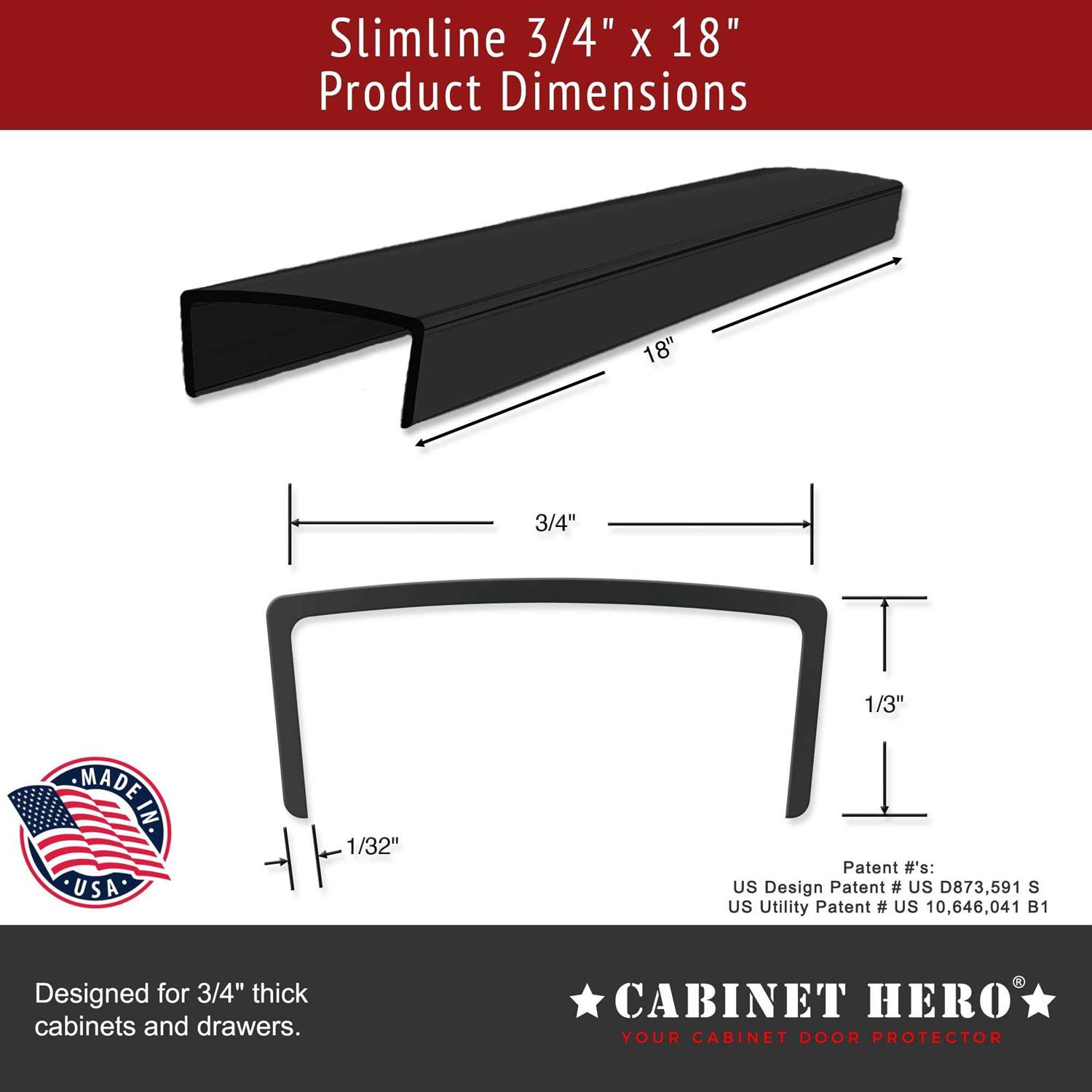 Our Cabinet Hero Slimline will NOT fit doors bigger or smaller than 3/4″. Length can be trimmed to fit smaller doors. Total of 4 individual pieces of 18” long Slimline Cabinet Hero Edge protectors included The “Slimline” is a low profile slip-on cover to guard the top edge of a cabinet door or drawer front. The thin design can fit cabinets with tight closures such as face frame, Euro and Inset style cabinets. It can also be placed on the side or bottom edge of a door/drawer to protect against nicks from brooms or vacuums when cleaning. Easily protect your cabinets from daily wear, discoloration, chipping, peeling, and water drips without sacrificing your kitchen’s appearance. No adhesive is needed to secure the guard. Simply slip the guard off when needed to reveal clean cabinets. Veteran Owned Business. Proudly made in the USA out of a rigid Black plastic (True Black Color) that is trimmable with scissors or a utility knife. US Design Patent # US D873,591 S & US Utility Patent # US 10,646,041 B1 -“Cabinet protectors are flexible, resilient U-channels for mounting on the upper edge of a cabinet door or drawer front to protect the edge from impact and wear”. Cabinet Hero Slimline door protector is a very low-profile guard that clips onto the top edge of a door or drawer to protect against guard against nicks, chipping, peeling, and water drips. It can also click onto the side and bottom of a door/drawer to protect from nicks. The Slimline fits FLAT TOP, 3/4″ thick doors and drawer fronts even on tight fit Euro-Style & Inset Cabinets. Comes in 18″, 24″, and 36″ lengths – can be cut to fit smaller doors/drawer fronts. Child and pet safe. PROUDLY MADE IN THE USA! Color: BLACK.