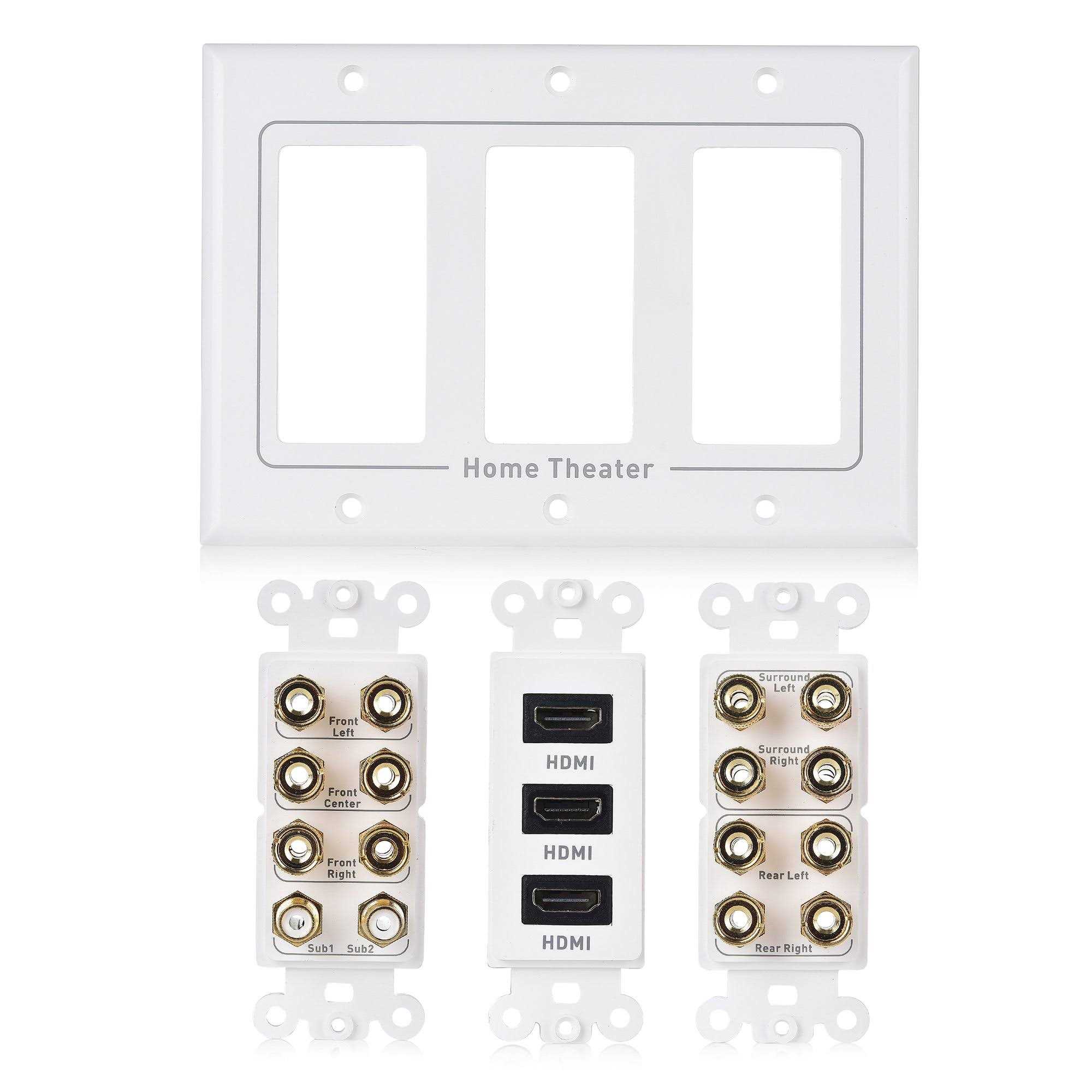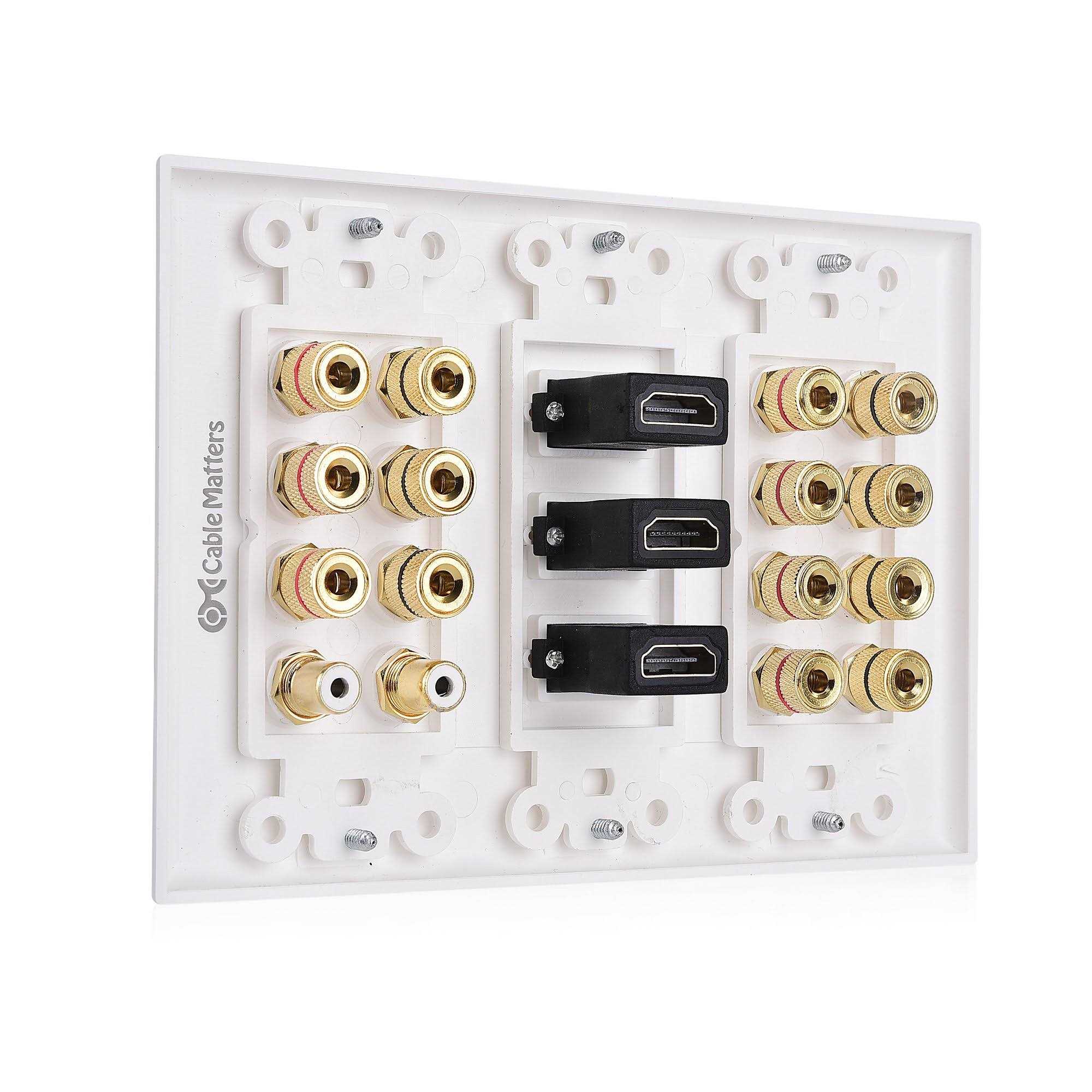Wall Plates & Connectors by Cable Matters. Details:CONNECT MORE with Cable Matters A/V Products 4K Video + Surround Sound Arrangement The Cable Matters Double-Gang 7.2 Surround Sound Distribution Wall Plate with 3x HDMI connects 7 speakers, 2 subwoofers and three devices with HDMI in a 7.2 Surround Sound system. Conceal the wires from your home theater system in the wall instead of fastening them to the baseboard for a secure and professional-looking installation. Connect the binding posts with 12 to 18 AWG bare speaker wire, banana plugs, or spade connectors and two subwoofers with RCA cables. Connect a CATV box, media streamer, and gaming console to your UHD TV with HDMI. This three.